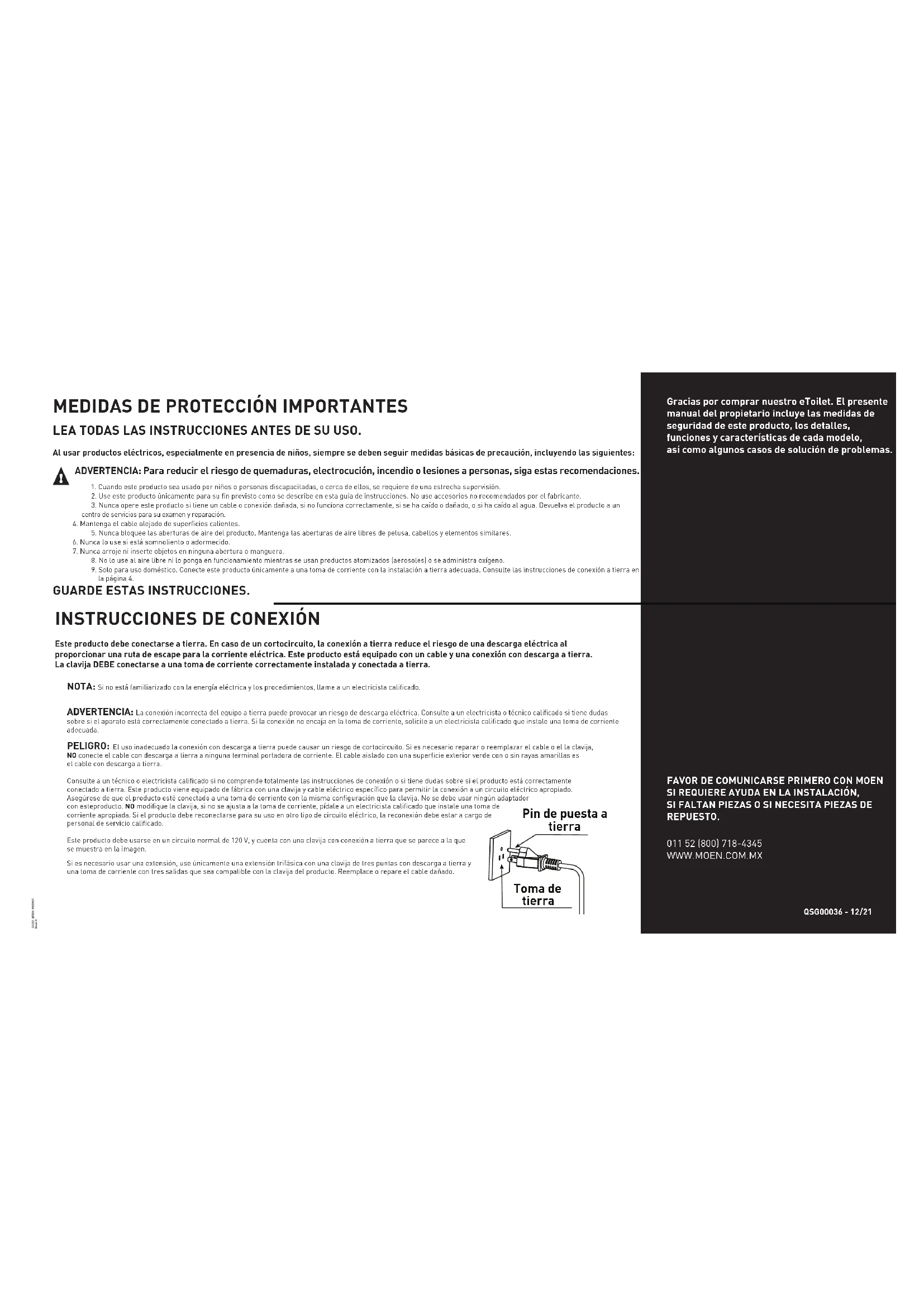 AYUDA. LA FUNCIÓN DE LIMPIEZA NO TRABAJA NORMALMENTE. EL SENSOR DEL ASIENTO NO FUNCIONA. FAVOR DE COMUNICARSE CON MOEN PARA OBTENER AYUDA. LAS FUNCIONES DE BOQUILLA Y/O SECADOR NO FUNCIONAN. EL USUARIO DEBE ESTAR SENTADO EN EL INODORO Y DEBE ESTAR TOCANDO EL SENSOR DEL ASIENTO. QSG00036 - 12/21GARANTÍA LIMITADA DE TRES AÑOS 3 Year Limited Warranty Los productos Moen® se fabrican conforme a los más altos estándares de calidad y mano de obra. Moen garantiza al comprador original que estos productos (bidet electrónico o inodoro electrónico) no tendrán fugas ni goteos durante el uso residencial normal y que todas las partes y acabados de estos productos estarán libres de defectos en el material y la fabricación por tres (3) años a partir de la fecha de compra original del consumidor para uso residencial (el “Periodo de Garantía” para los propietarios de la vivienda). Cualquier otro tipo de compra (incluyendo las compras para uso industrial, comercial o de negocios) tienen una garantía de un (1) año a partir de la fecha original de compra (el “Periodo de Garantía” para las personas que no sean propietarias de la vivienda). Si el bidet electrónico o el inodoro electrónico llegaran a presentar fugas o goteos durante el Periodo de Garantía, Moen le proporcionará GRATUITAMENTE las piezas necesarias para restablecer el funcionamiento óptimo del producto y reemplazará GRATUITAMENTE cualquier pieza o acabado que presente defectos con respecto a los materiales y a la fabricación, bajo instalación, uso y servicio normales. Puede solicitar piezas de repuesto llamando al 1-800-289-6636 (en Canadá, 1-800-465-6130) o escribiendo a Moen Incorporated, 25300 Al Moen Drive, North Olmsted, OH 44070-8022 (en Canadá, Moen, 2816 Bristol Circle, Oakville, Ontario L6H5S7, Canada). El comprobante de compra (recibo de compra original) del comprador original debe acompañar todos los reclamos de garantía. Los defectos o daños causados por el uso de piezas que no sean originales de Moen no están cubiertos por esta garantía. Esta garantía es aplicable solo a los productos adquiridos después de diciembre de 1995 y entrará en vigor a partir de la fecha de compra que se muestra en el recibo del comprador. Esta garantía es amplia ya que cubre el reemplazo de todas las piezas y acabados defectuosos. Sin embargo, los daños ocasionados por errores de instalación, abuso del producto, mal uso del producto o uso de limpiadores que contengan abrasivos, alcohol u otros solventes orgánicos, ya sea que los realice un contratista, una compañía de servicio o usted mismo, están excluidos de esta garantía. Moen no será responsable de los cargos por mano de obra y/o daños incurridos en la instalación, reparación o reemplazo, ni por los daños, pérdidas, lesiones o costos indirectos, incidentales o consecuentes de cualquier naturaleza relacionados con estos productos. Salvo lo dispuesto por la ley, esta garantía reemplaza y excluye todas las demás garantías, condiciones y garantías, ya sean expresas o implícitas, legales o de otro tipo, incluyendo, sin restricción, las de comerciabilidad o idoneidad para el uso. Algunos estados, provincias y países no permiten la exclusión o limitación de daños incidentales o consecuentes, por lo que las limitaciones o exclusiones anteriores pueden no aplicarse en su caso. Esta garantía le otorga derechos legales específicos y también puede tener otros derechos que varían de un estado a otro, de una provincia a otra o de un país a otro. Moen le asesorará sobre el procedimiento a seguir para realizar alguna reclamación de garantía. Solo escriba a Moen a la dirección correspondiente indicada anteriormente. Explique el defecto e incluya un comprobante de compra y su nombre, dirección, código de área y número de teléfono. Moen de México, S.A. de C.V. Carretera Saltillo-Monterrey KM 14.7 Ramos Arizpe, Coahuila México 25900 ©2023 MOEN INCORPORATED