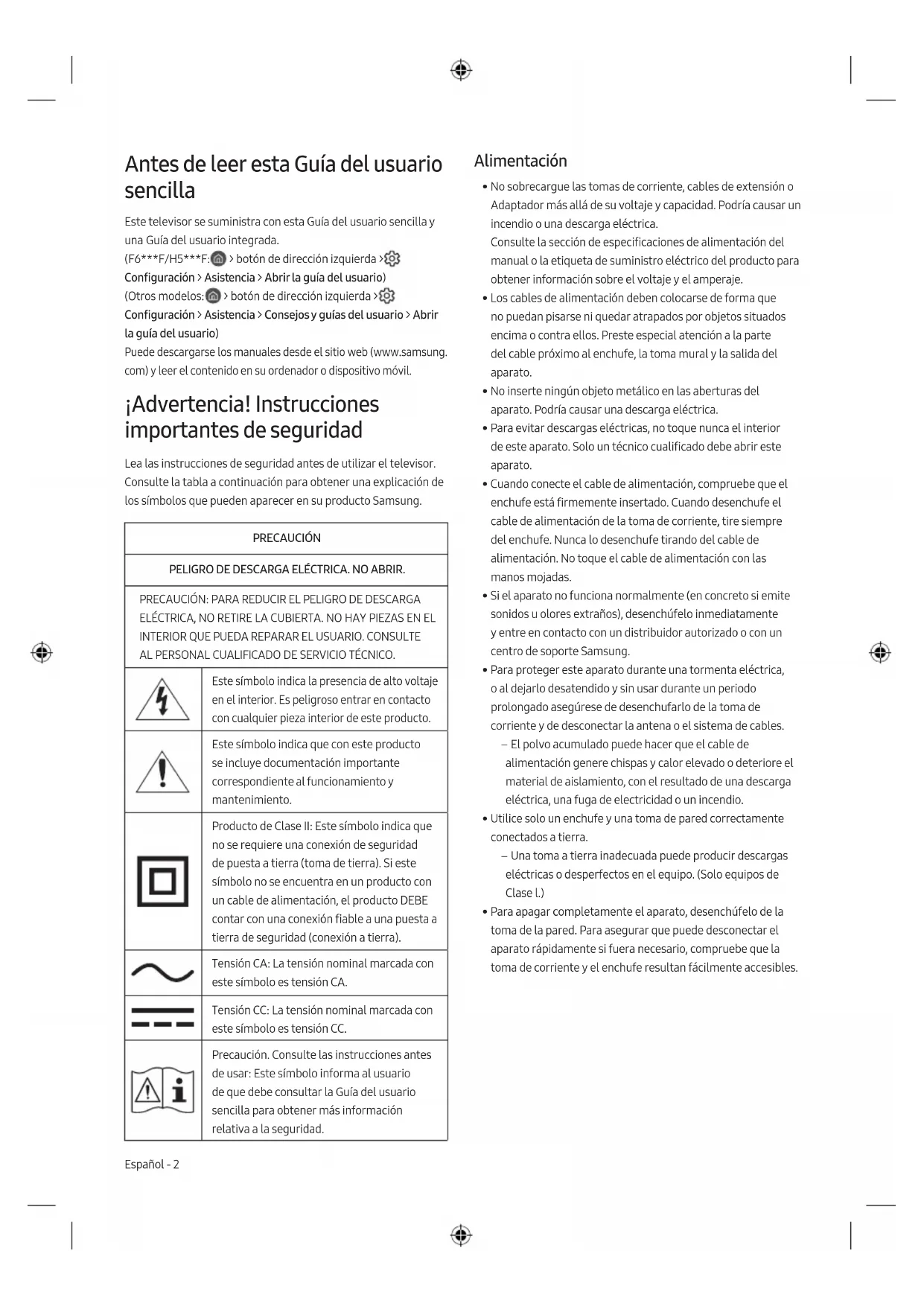 - Para apagar completamente el aparato, desenchúfelo de la toma de la pared. Para asegurar que puede desconectar el aparato rápidamente si fuera necesario, compruebe que la toma de corriente y el enchufe resultan fácilmente accesibles. Antes de leer esta Guía del usuario sencilla Este televisor se suministra con esta Guía del usuario sencilla y una Guía del usuario integrada. (F6***F/H5***F: > botón de dirección izquierda > Configuración > Asistencia > Abrir la guía del usuario) (Otros modelos: > botón de dirección izquierda > Configuración > Asistencia > Consejos y guías del usuario > Abrir la guía del usuario) Puede descargarse los manuales desde el sitio web (www.samsung. com) y leer el contenido en su ordenador o dispositivo móvil. ¡Advertencia! Instrucciones importantes de seguridad Lea las instrucciones de seguridad antes de utilizar el televisor. Consulte la tabla a continuación para obtener una explicación de los símbolos que pueden aparecer en su producto Samsung. PRECAUCIÓN PELIGRO DE DESCARGA ELÉCTRICA. NO ABRIR. PRECAUCIÓN: PARA REDUCIR EL PELIGRO DE DESCARGA ELÉCTRICA, NO RETIRE LA CUBIERTA. NO HAY PIEZAS EN EL INTERIOR QUE PUEDA REPARAR EL USUARIO. CONSULTE AL PERSONAL CUALIFICADO DE SERVICIO TÉCNICO. Este símbolo indica la presencia de alto voltaje en el interior. Es peligroso entrar en contacto con cualquier pieza interior de este producto. Este símbolo indica que con este producto se incluye documentación importante correspondiente al funcionamiento y mantenimiento. Producto de Clase II: Este símbolo indica que no se requiere una conexión de seguridad de puesta a tierra (toma de tierra). Si este símbolo no se encuentra en un producto con un cable de alimentación, el producto DEBE contar con una conexión fiable a una puesta a tierra de seguridad (conexión a tierra). Tensión CA: La tensión nominal marcada con este símbolo es tensión CA. Tensión CC: La tensión nominal marcada con este símbolo es tensión CC. Precaución. Consulte las instrucciones antes de usar: Este símbolo informa al usuario de que debe consultar la Guía del usuario sencilla para obtener más información relativa a la seguridad. Español Español - 2Instalación