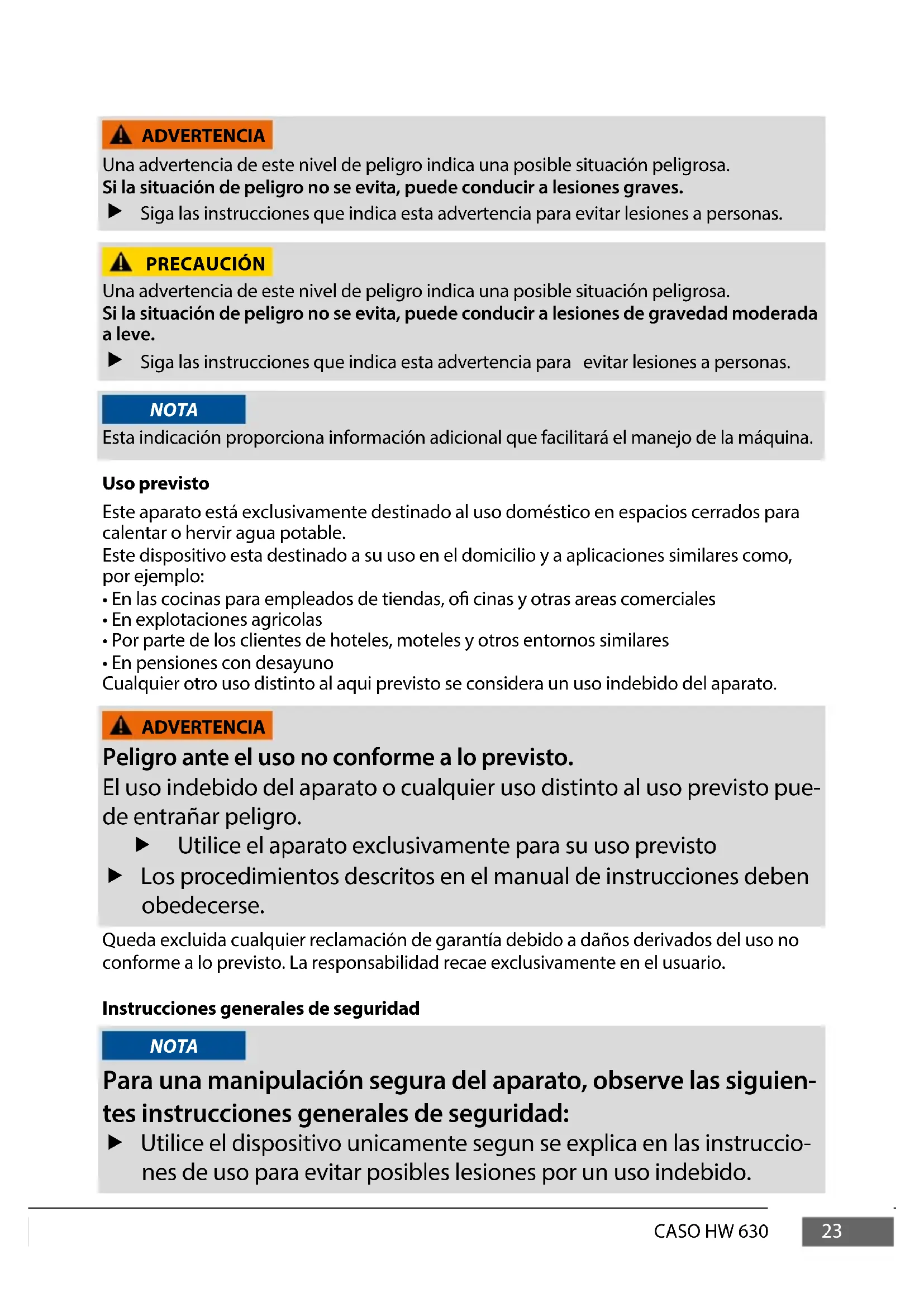 - La sécurité électrique de l‘appareil est garantie uniquement lorsqu‘il est raccordé à un circuit électrique avec un système de protection installé en toute conformité. En cas de doute faites vérier l‘ensemble de l‘installation électrique par un électricien. Le constructeur ne peut pas être tenu responsable pour les dégâts causés par un conducteur de masse absent ou interrompu. ES Seguridad Advertencias En el presente manual se utilizan las siguientes advertencias: PELIGRO Una advertencia de este nivel de peligro indica una situación peligrosa. Si la situación peligrosa no se evita, puede causar la muerte o lesiones graves. f Siga las instrucciones que indica esta advertencia para evitar el peligro de muerte o de lesiones graves a personas.23 CASO HW 630 ADVERTENCIA Una advertencia de este nivel de peligro indica una posible situación peligrosa. Si la situación de peligro no se evita, puede conducir a lesiones graves. f Siga las instrucciones que indica esta advertencia para evitar lesiones a personas. PRECAUCIÓN Una advertencia de este nivel de peligro indica una posible situación peligrosa. Si la situación de peligro no se evita, puede conducir a lesiones de gravedad moderada a leve. f Siga las instrucciones que indica esta advertencia para evitar lesiones a personas. Esta indicación proporciona información adicional que facilitará el manejo de la máquina. Uso previsto Este aparato está exclusivamente destinado al uso doméstico en espacios cerrados para calentar o hervir agua potable. Este dispositivo esta destinado a su uso en el domicilio y a aplicaciones similares como, por ejemplo: