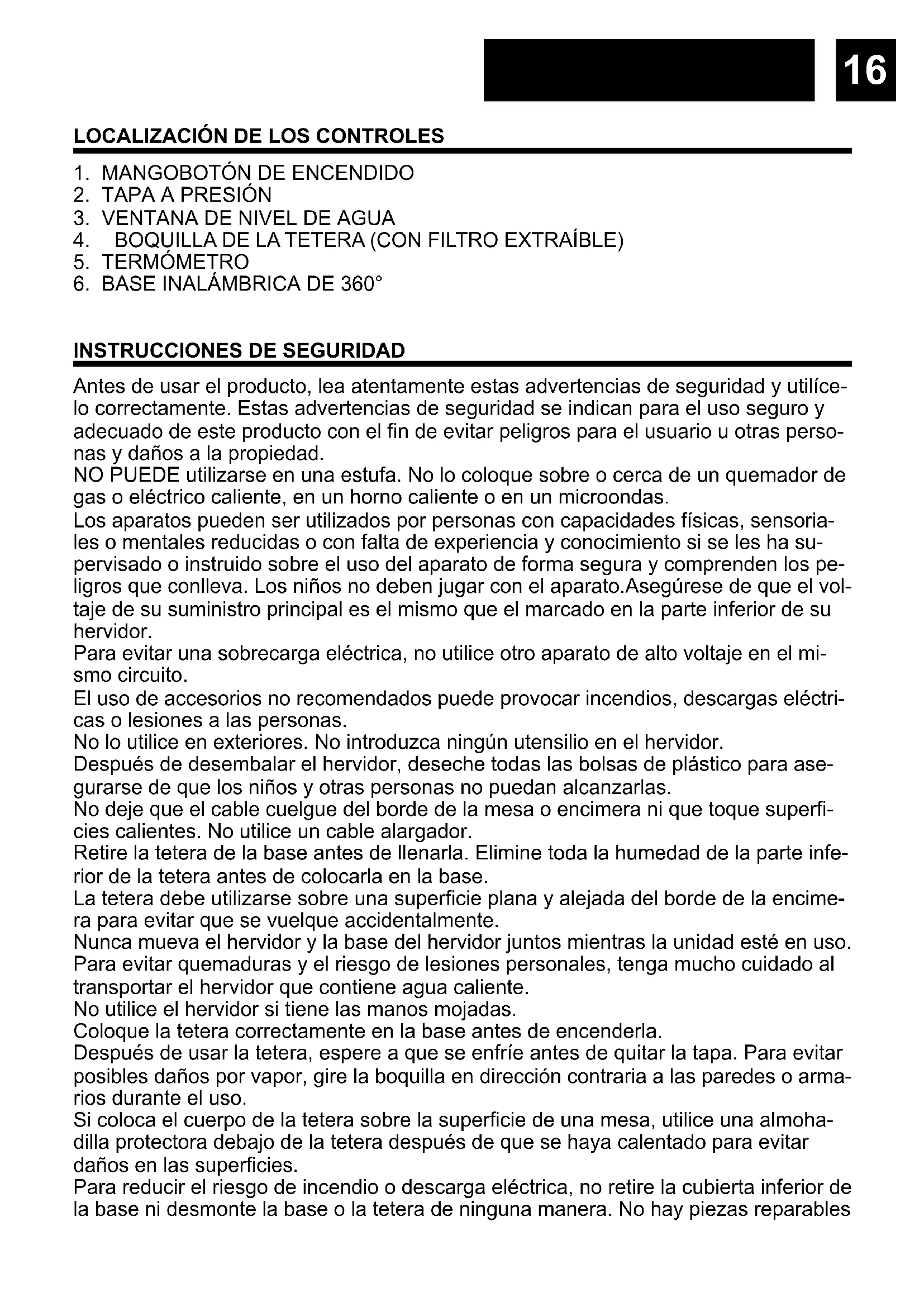 (material electrico y electrónico de descarte) ATTENTIÓN El símbolo de exclamación dentro un triángulo tiene el objeto de advertir al usuario de la presencia de instrucciones importantes de funcionamiento y mantenimiento en la documentación adjunta con el equi-po. El símbolo del rayo con punta de flecha dentro de un triángulo adverte al usuario de la presencia de tensiones peligrosas en el equipo. Para reducir los riesgos de descargas eléctricas, no retire la cubierta. La unidad no hay en su enterior componentes que pueda manipular el usuario. Encargue su reparación a personal cualificado. Esta unidad funciona con 230V ~ 50Hz. Cuando el equipo vaya a estar un tiempo prolongado sin utili-zarse, desenchufar el cable de alimentación. No conecte la unidad hasta que no se hayan efectuado todas las otras conexiones. La unidad no debería ser expuesta a lluvia o humedad. La unidad se debe instalar de forma que su posición no le impida tener ventilación adecuada. Por ejem-plo, el equipo no se debe colocar cerca de cortinas o sobre el tapete, ni en una instalación como puede ser un armario. La unidad no debería ser expuesta a la luz solar directa ni a fuentes emisora de calor. ESPECIFICACIONESTÉCNICAS Fuente de alimentación: CA 220-240 V ~ 50/60 Hz. 1850- 2200 vatios Modo Standy(off) menos de 0,3 W Capacidad: 1,8 litros (máx.)