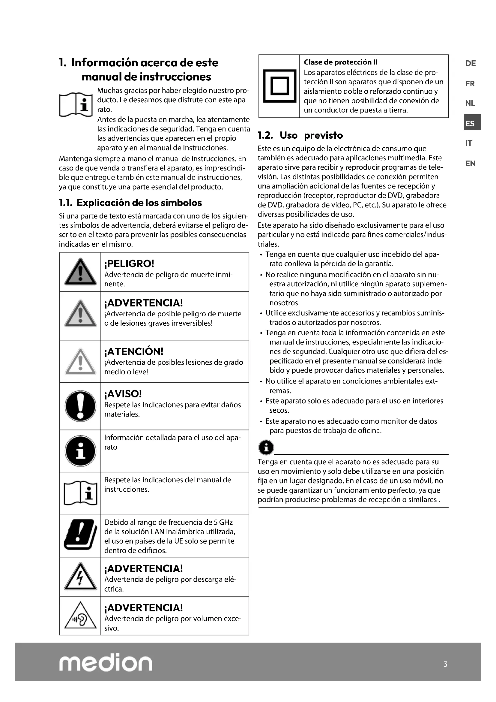 manual de instrucciones Muchas gracias por haber elegido nuestro pro- ducto. Le deseamos que disfrute con este apa- rato. Antes de la puesta en marcha, lea atentamente las indicaciones de seguridad. Tenga en cuenta las advertencias que aparecen en el propio aparato y en el manual de instrucciones. Mantenga siempre a mano el manual de instrucciones. En caso de que venda o transfiera el aparato, es imprescindi- ble que entregue también este manual de instrucciones, ya que constituye una parte esencial del producto. 1.1. Explicación de los símbolos Si una parte de texto está marcada con uno de los siguien- tes símbolos de advertencia, deberá evitarse el peligro de- scrito en el texto para prevenir las posibles consecuencias indicadas en el mismo. ¡PELIGRO! Advertencia de peligro de muerte inmi- nente. ¡ADVERTENCIA! ¡Advertencia de posible peligro de muerte o de lesiones graves irreversibles! ¡ATENCIÓN! ¡Advertencia de posibles lesiones de grado medio o leve! ¡AVISO! Respete las indicaciones para evitar daños materiales. Información detallada para el uso del apa- rato Respete las indicaciones del manual de instrucciones. Debido al rango de frecuencia de 5GHz de la solución LAN inalámbrica utilizada, el uso en países de la UE solo se permite dentro de edificios. ¡ADVERTENCIA! Advertencia de peligro por descarga elé- ctrica. ¡ADVERTENCIA! Advertencia de peligro por volumen exce- sivo. Clase de protección II Los aparatos eléctricos de la clase de pro- tecciónII son aparatos que disponen de un aislamiento doble o reforzado continuo y que no tienen posibilidad de conexión de un conductor de puesta a tierra. 1.2. Uso previsto Este es un equipo de la electrónica de consumo que también es adecuado para aplicaciones multimedia. Este aparato sirve para recibir y reproducir programas de tele- visión. Las distintas posibilidades de conexión permiten una ampliación adicional de las fuentes de recepción y reproducción (receptor, reproductor de DVD, grabadora de DVD, grabadora de vídeo, PC, etc.). Su aparato le ofrece diversas posibilidades de uso. Este aparato ha sido diseñado exclusivamente para el uso particular y no está indicado para fines comerciales/indus- triales.