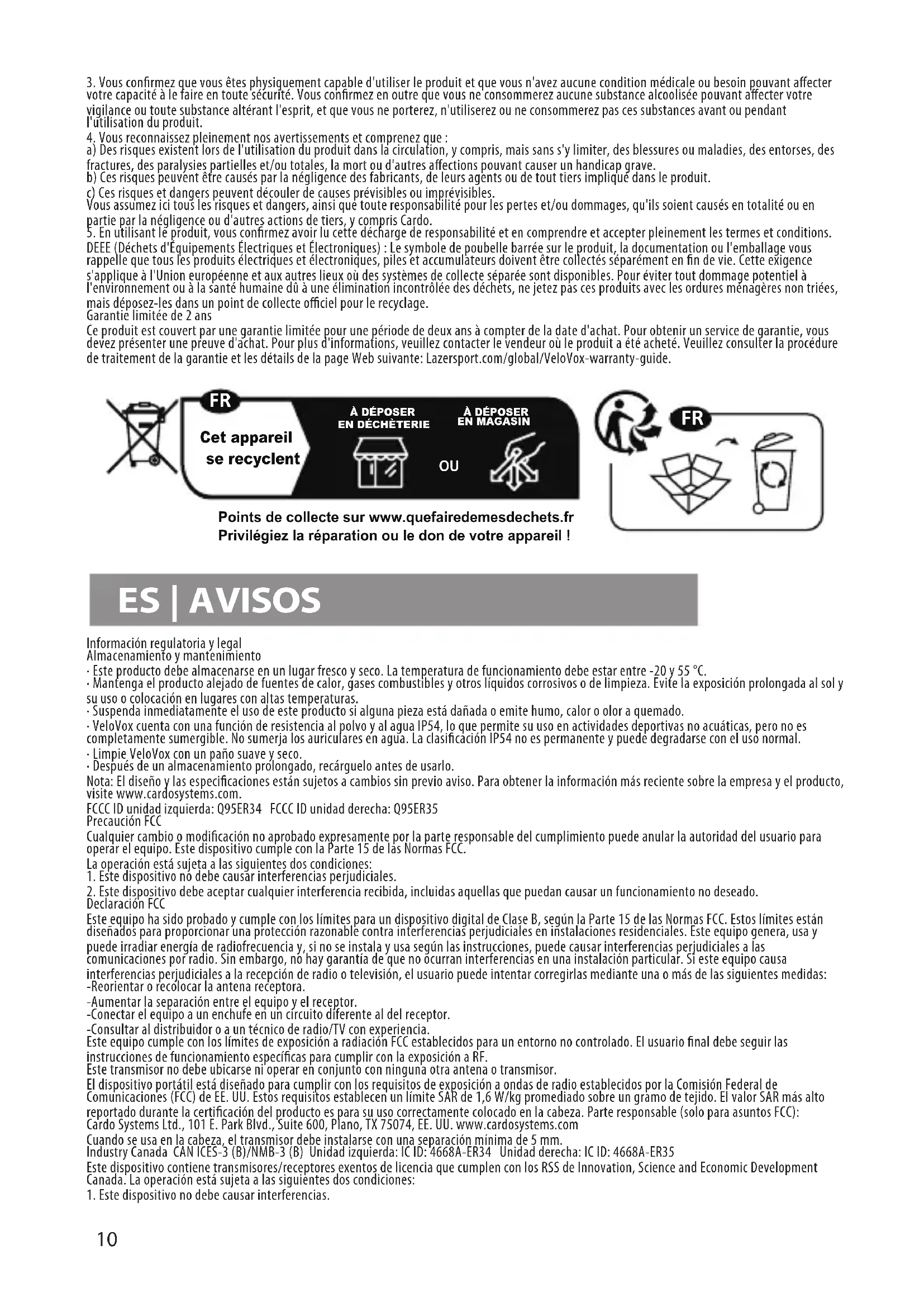 - Limpie VeloVox con un paño suave y seco.· Después de un almacenamiento prolongado, recárguelo antes de usarlo. Nota: El diseño y las especificaciones están sujetos a cambios sin previo aviso. Para obtener la información más reciente sobre la empresa y el producto, visite www.cardosystems.com.FCCC ID unidad izquierda: Q95ER34 FCCC ID unidad derecha: Q95ER35Precaución FCC Cualquier cambio o modificación no aprobado expresamente por la parte responsable del cumplimiento puede anular la autoridad del usuario para operar el equipo. Este dispositivo cumple con la Parte 15 de las Normas FCC.La operación está sujeta a las siguientes dos condiciones:1. Este dispositivo no debe causar interferencias perjudiciales. 2. Este dispositivo debe aceptar cualquier interferencia recibida, incluidas aquellas que puedan causar un funcionamiento no deseado. Declaración FCC Este equipo ha sido probado y cumple con los límites para un dispositivo digital de Clase B, según la Parte 15 de las Normas FCC. Estos límites están diseñados para proporcionar una protección razonable contra interferencias perjudiciales en instalaciones residenciales. Este equipo genera, usa y puede irradiar energía de radiofrecuencia y, si no se instala y usa según las instrucciones, puede causar interferencias perjudiciales a las comunicaciones por radio. Sin embargo, no hay garantía de que no ocurran interferencias en una instalación particular. Si este equipo causa interferencias perjudiciales a la recepción de radio o televisión, el usuario puede intentar corregirlas mediante una o más de las siguientes medidas: -Reorientar o recolocar la antena receptora.-Aumentar la separación entre el equipo y el receptor.-Conectar el equipo a un enchufe en un circuito diferente al del receptor.-Consultar al distribuidor o a un técnico de radio/TV con experiencia. Este equipo cumple con los límites de exposición a radiación FCC establecidos para un entorno no controlado. El usuario final debe seguir las instrucciones de funcionamiento específicas para cumplir con la exposición a RF.Este transmisor no debe ubicarse ni operar en conjunto con ninguna otra antena o transmisor. El dispositivo portátil está diseñado para cumplir con los requisitos de exposición a ondas de radio establecidos por la Comisión Federal de Comunicaciones (FCC) de EE. UU. Estos requisitos establecen un límite SAR de 1,6 W/kg promediado sobre un gramo de tejido. El valor SAR más alto reportado durante la certificación del producto es para su uso correctamente colocado en la cabeza. Parte responsable (solo para asuntos FCC): Cardo Systems Ltd., 101 E. Park Blvd., Suite 600, Plano, TX 75074, EE. UU. www.cardosystems.comCuando se usa en la cabeza, el transmisor debe instalarse con una separación mínima de 5 mm.Industry Canada CAN ICES-3 (B)/NMB-3 (B) Unidad izquierda: IC ID: 4668A-ER34 Unidad derecha: IC ID: 4668A-ER35 Este dispositivo contiene transmisores/receptores exentos de licencia que cumplen con los RSS de Innovation, Science and Economic Development Canada. La operación está sujeta a las siguientes dos condiciones:1. Este dispositivo no debe causar interferencias. Cet appareil se recyclent Points de collecte sur www.quefairedemesdechets.frPrivilégiez la réparation ou le don de votre appareil !À DÉPOSEREN MAGASINÀ DÉPOSEREN DÉCHÈTERIE
