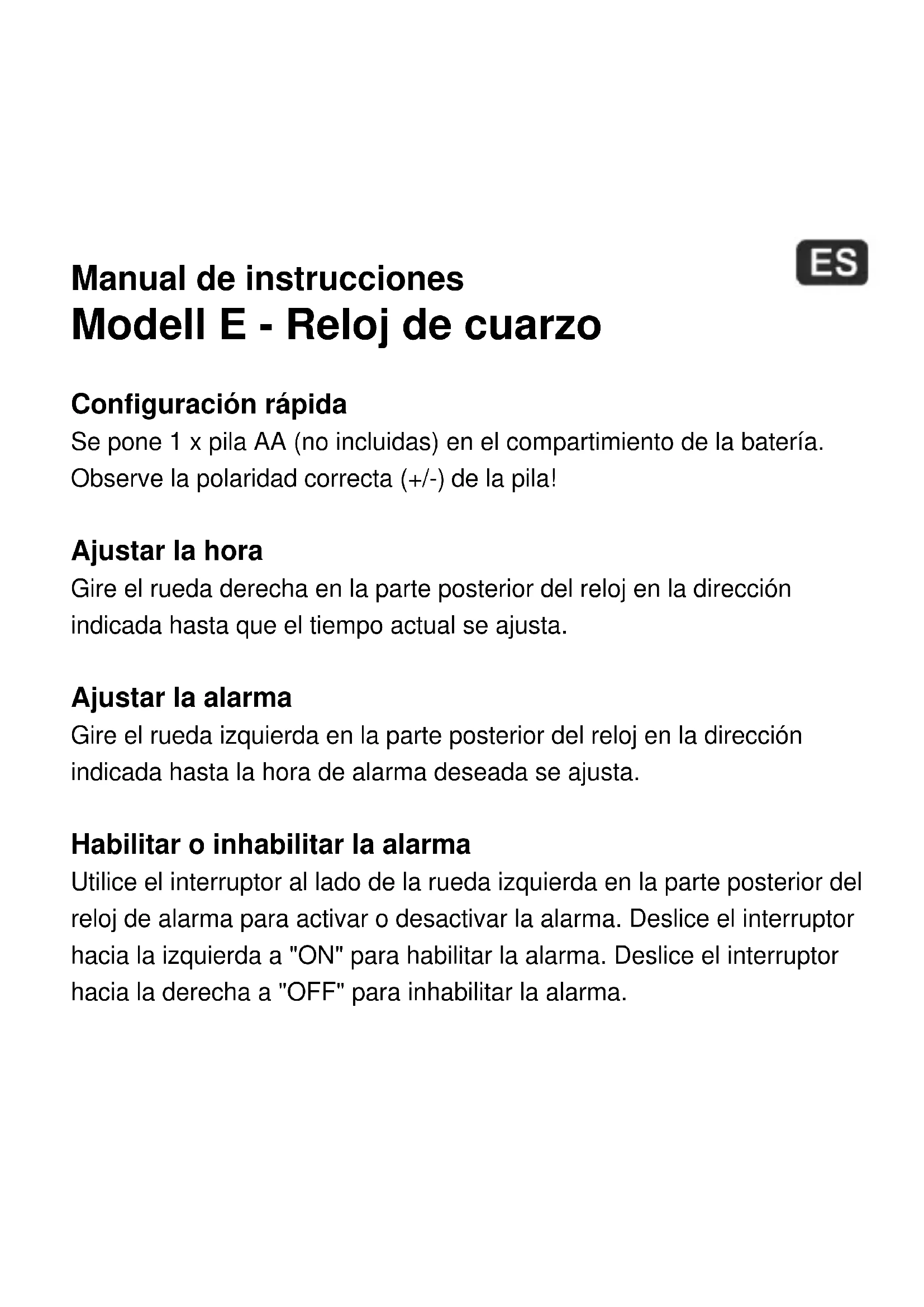 Séparez le carton d’emballage de tout sous carton éventuel en plastique. Tout bien trier conformément aux règlementations en matière de séparation des déchets.Manual de instrucciones Modell E - Reloj de cuarzo Configuración rápida Se pone 1 x pila AA (no incluidas) en el compartimiento de la batería. Observe la polaridad correcta (+/-) de la pila! Ajustar la hora Gire el rueda derecha en la parte posterior del reloj en la dirección indicada hasta que el tiempo actual se ajusta. Ajustar la alarma Gire el rueda izquierda en la parte posterior del reloj en la dirección indicada hasta la hora de alarma deseada se ajusta. Habilitar o inhabilitar la alarma Utilice el interruptor al lado de la rueda izquierda en la parte posterior del reloj de alarma para activar o desactivar la alarma. Deslice el interruptor hacia la izquierda a "ON" para habilitar la alarma. Deslice el interruptor hacia la derecha a "OFF" para inhabilitar la alarma.Iluminación & función de repetición de alarma Pulse el botón "SNOOZE/LIGHT" en la parte superior del despertador para encender la iluminación de la esfera. Si pulsa el botón "SNOOZE/LIGHT" durante la alarma, se activa la función de repetición. La alarma vuelve a sonar después de unos 4 minutos. Si su reloj de alarma muestra las grandes desviaciones de tiempo o un cambio en la tono de alarma, coloque pilas nuevas. Precauciones Esta unidad está diseñada para usarla solamente en interiores. No someta unidad a fuerzas o golpes excesivos. No exponga la unidad a temperaturas extremas, directa a los rayos del sol, polvo o humedad. No la sumerja en el agua. Evite el contacto con cualquier material corrosivo. No se deshaga de esta unidad arrojándola al fuego ya que puede explotar. No abra la carcasa trasera interior ni manipule ninguno de los componentes de esta unidad.Advertencias de seguridad sobre las baterías Por favor, lea detenidamente todas las instrucciones antes de usarla. Utilizar solamente baterías alcalinas. No utilizar recargables baterías. Coloque las baterías correctamente haciendo coincidir la polaridad