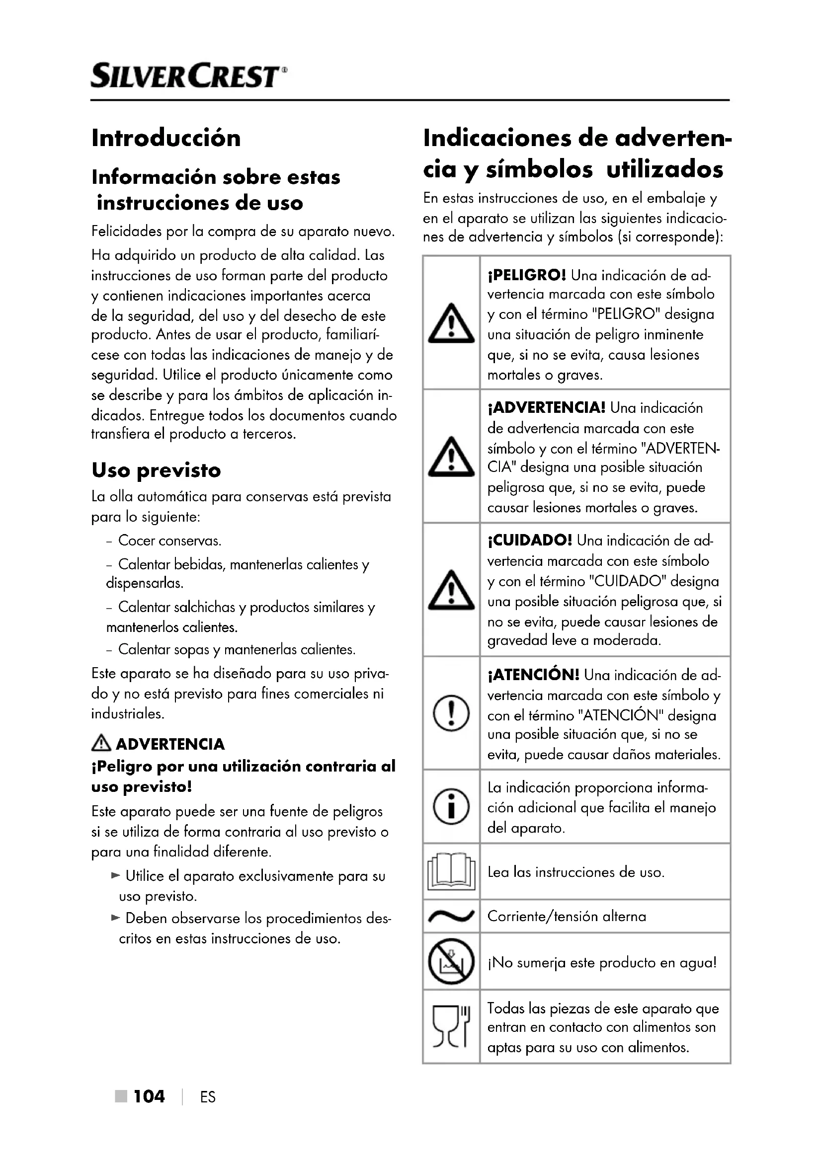 ES Introducción Información sobre estas instrucciones de uso Felicidades por la compra de su aparato nuevo. Ha adquirido un producto de alta calidad. Las instrucciones de uso forman parte del producto y contienen indicaciones importantes acerca de la seguridad, del uso y del desecho de este producto. Antes de usar el producto, familiarí- cese con todas las indicaciones de manejo y de seguridad. Utilice el producto únicamente como se describe y para los ámbitos de aplicación in- dicados. Entregue todos los documentos cuando transfiera el producto a terceros. Uso previsto La olla automática para conservas está prevista para lo siguiente: – Cocer conservas. – Calentar bebidas, mantenerlas calientes y dispensarlas. – Calentar salchichas y productos similares y mantenerlos calientes. – Calentar sopas y mantenerlas calientes. Este aparato se ha diseñado para su uso priva- do y no está previsto para fines comerciales ni industriales. ADVERTENCIA ¡Peligro por una utilización contraria al uso previsto! Este aparato puede ser una fuente de peligros si se utiliza de forma contraria al uso previsto o para una finalidad diferente. ► Utilice el aparato exclusivamente para su uso previsto. ► Deben observarse los procedimientos des- critos en estas instrucciones de uso. Indicaciones de adverten- cia y símbolos utilizados En estas instrucciones de uso, en el embalaje y en el aparato se utilizan las siguientes indicacio- nes de advertencia y símbolos (si corresponde): ¡PELIGRO! Una indicación de ad- vertencia marcada con este símbolo y con el término "PELIGRO" designa una situación de peligro inminente que, si no se evita, causa lesiones mortales o graves. ¡ADVERTENCIA! Una indicación de advertencia marcada con este símbolo y con el término "ADVERTEN- CIA" designa una posible situación peligrosa que, si no se evita, puede causar lesiones mortales o graves. ¡CUIDADO! Una indicación de ad- vertencia marcada con este símbolo y con el término "CUIDADO" designa una posible situación peligrosa que, si no se evita, puede causar lesiones de gravedad leve a moderada. ¡ATENCIÓN! Una indicación de ad- vertencia marcada con este símbolo y con el término "ATENCIÓN" designa una posible situación que, si no se evita, puede causar daños materiales. La indicación proporciona informa- ción adicional que facilita el manejo del aparato. Lea las instrucciones de uso. Corriente/tensión alterna ¡No sumerja este producto en agua! Todas las piezas de este aparato que entran en contacto con alimentos son aptas para su uso con alimentos. IB_472575_SEAD1800B2_LB8.indb 104 11.10.2024 11:45:21ES