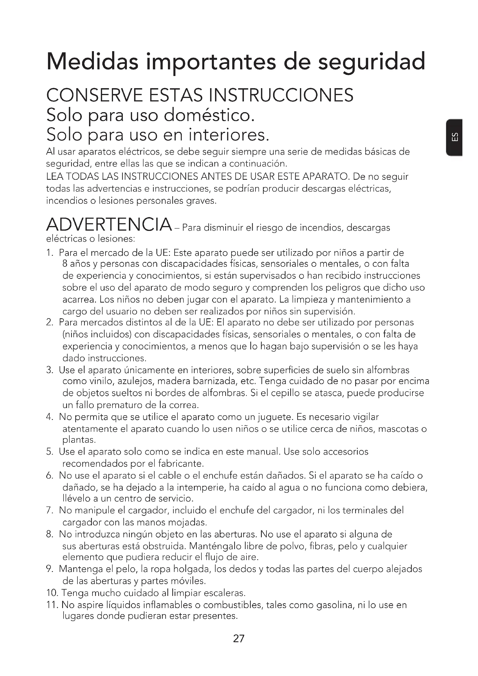 Solo para uso doméstico. Solo para uso en interiores. Al usar aparatos eléctricos, se debe seguir siempre una serie de medidas básicas de seguridad, entre ellas las que se indican a continuación. LEA TODAS LAS INSTRUCCIONES ANTES DE USAR ESTE APARATO. De no seguir todas las advertencias e instrucciones, se podrían producir descargas eléctricas, incendios o lesiones personales graves. ADVERTENCIA – Para disminuir el riesgo de incendios, descargas eléctricas o lesiones:
