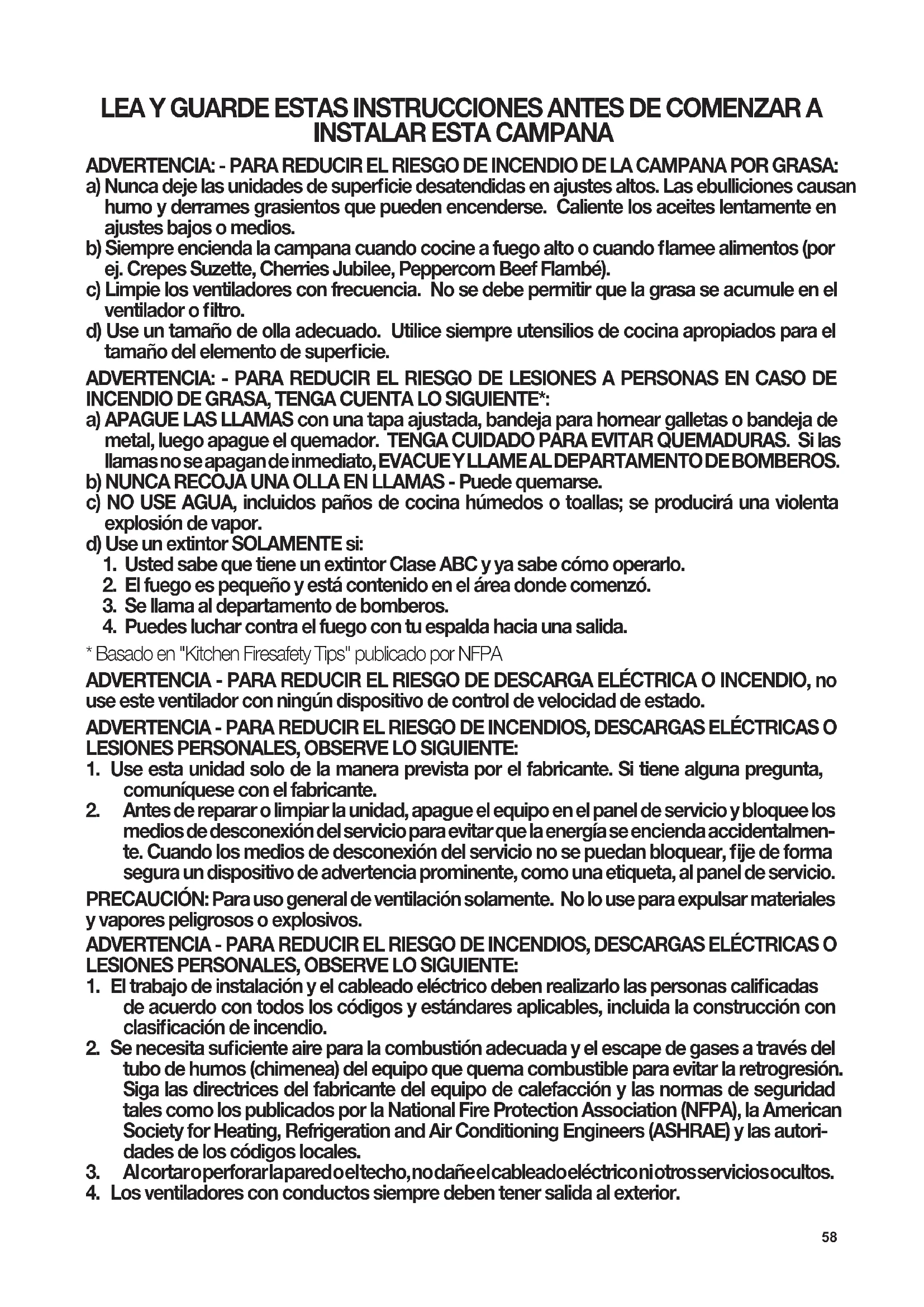 - Basado en "Kitchen Firesafety Tips" publicado por NFPA ADVERTENCIA - PARA REDUCIR EL RIESGO DE DESCARGA ELÉCTRICA O INCENDIO, no use este ventilador con ningún dispositivo de control de velocidad de estado. ADVERTENCIA - PARA REDUCIR EL RIESGO DE INCENDIOS, DESCARGAS ELÉCTRICAS O LESIONES PERSONALES, OBSERVE LO SIGUIENTE: