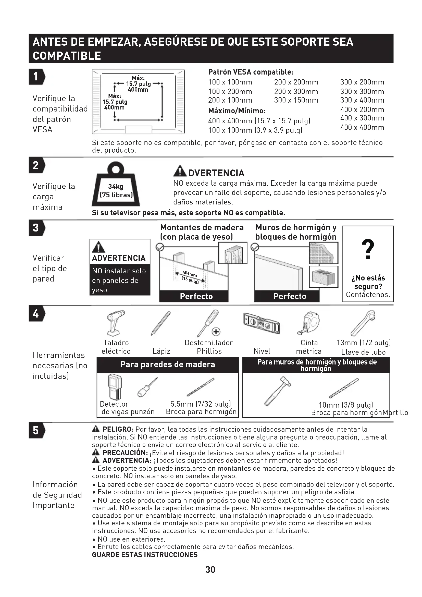 Información de Seguridad Importante Para paredes de madera 5.5mm (7/32 pulg)Broca para hormigónDetector de vigas punzón10mm (3/8 pulg)Broca para hormigónMartilloPara muros de hormigón y bloques de hormigón ANTES DE EMPEZAR, ASEGÚRESE DE QUE ESTE SOPORTE SEA COMPATIBLE NO exceda la carga máxima. Exceder la carga máxima puede provocar un fallo del soporte, causando lesiones personales y/o daños materiales. DVERTENCIA Si su televisor pesa más, este soporte NO es compatible.Máximo/Mínimo:400 x 400mm (15.7 x 15.7 pulg)100 x 100mm (3.9 x 3.9 pulg)Patrón VESA compatible:100 x 100mm100 x 200mm200 x 100mmSi este soporte no es compatible, por favor, póngase en contacto con el soporte técnico del producto.