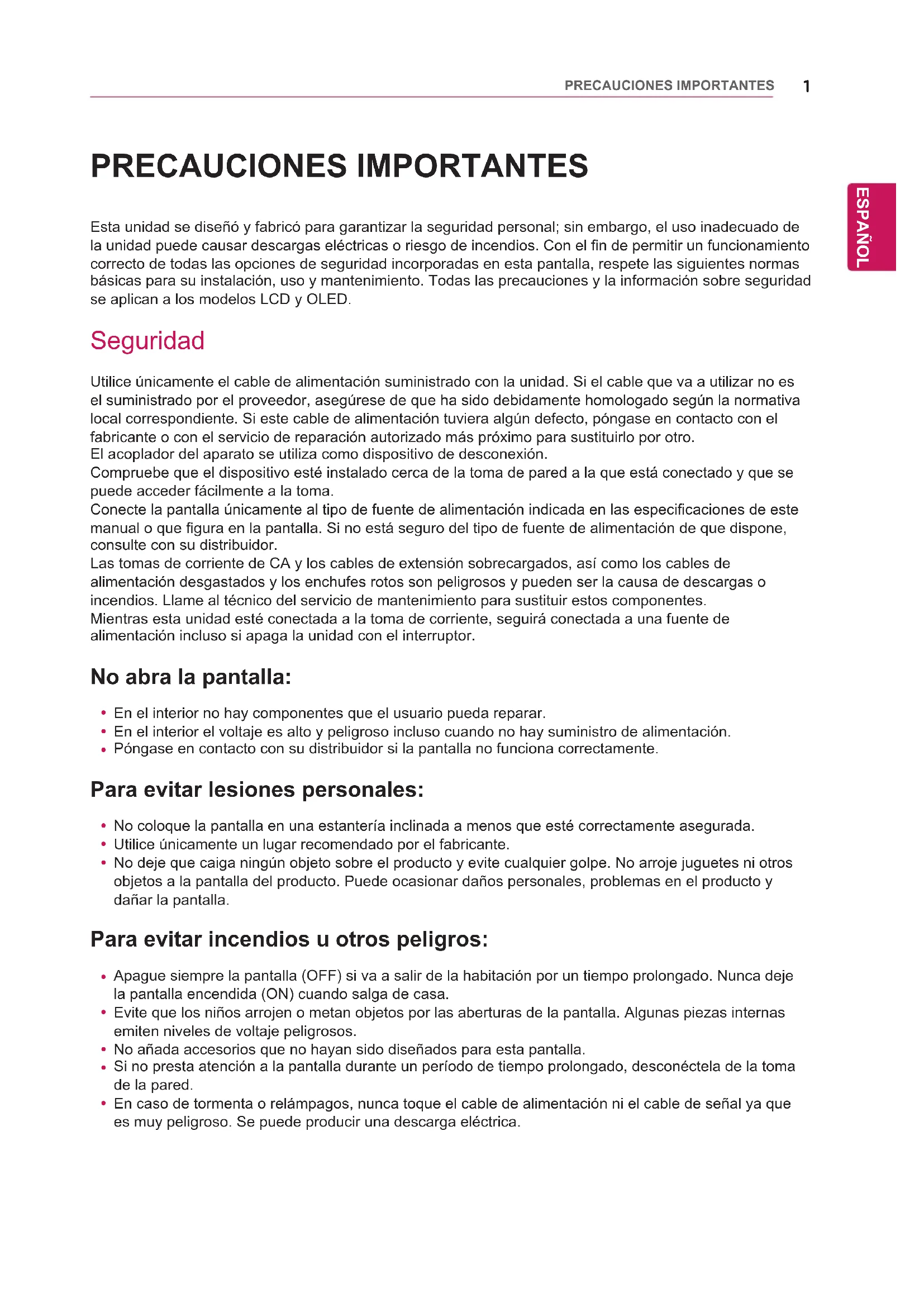 PRECAUCIONES IMPORTANTES Esta unidad se diseñó y fabricó para garantizar la seguridad personal; sin embargo, el uso inadecuado de la unidad puede causar descargas eléctricas o riesgo de incendios. Con el fin de permitir un funcionamiento correcto de todas las opciones de seguridad incorporadas en esta pantalla, respete las siguientes normas básicas para su instalación, uso y mantenimiento. Todas las precauciones y la información sobre seguridad se aplican a los modelos LCD y OLED. Seguridad Utilice únicamente el cable de alimentación suministrado con la unidad. Si el cable que va a utilizar no es el suministrado por el proveedor, asegúrese de que ha sido debidamente homologado según la normativa local correspondiente. Si este cable de alimentación tuviera algún defecto, póngase en contacto con el fabricante o con el servicio de reparación autorizado más próximo para sustituirlo por otro.El acoplador del aparato se utiliza como dispositivo de desconexión.Compruebe que el dispositivo esté instalado cerca de la toma de pared a la que está conectado y que se puede acceder fácilmente a la toma.Conecte la pantalla únicamente al tipo de fuente de alimentación indicada en las especificaciones de este manual o que figura en la pantalla. Si no está seguro del tipo de fuente de alimentación de que dispone, consulte con su distribuidor.Las tomas de corriente de CA y los cables de extensión sobrecargados, así como los cables de alimentación desgastados y los enchufes rotos son peligrosos y pueden ser la causa de descargas o incendios. Llame al técnico del servicio de mantenimiento para sustituir estos componentes.Mientras esta unidad esté conectada a la toma de corriente, seguirá conectada a una fuente de alimentación incluso si apaga la unidad con el interruptor. No abra la pantalla: