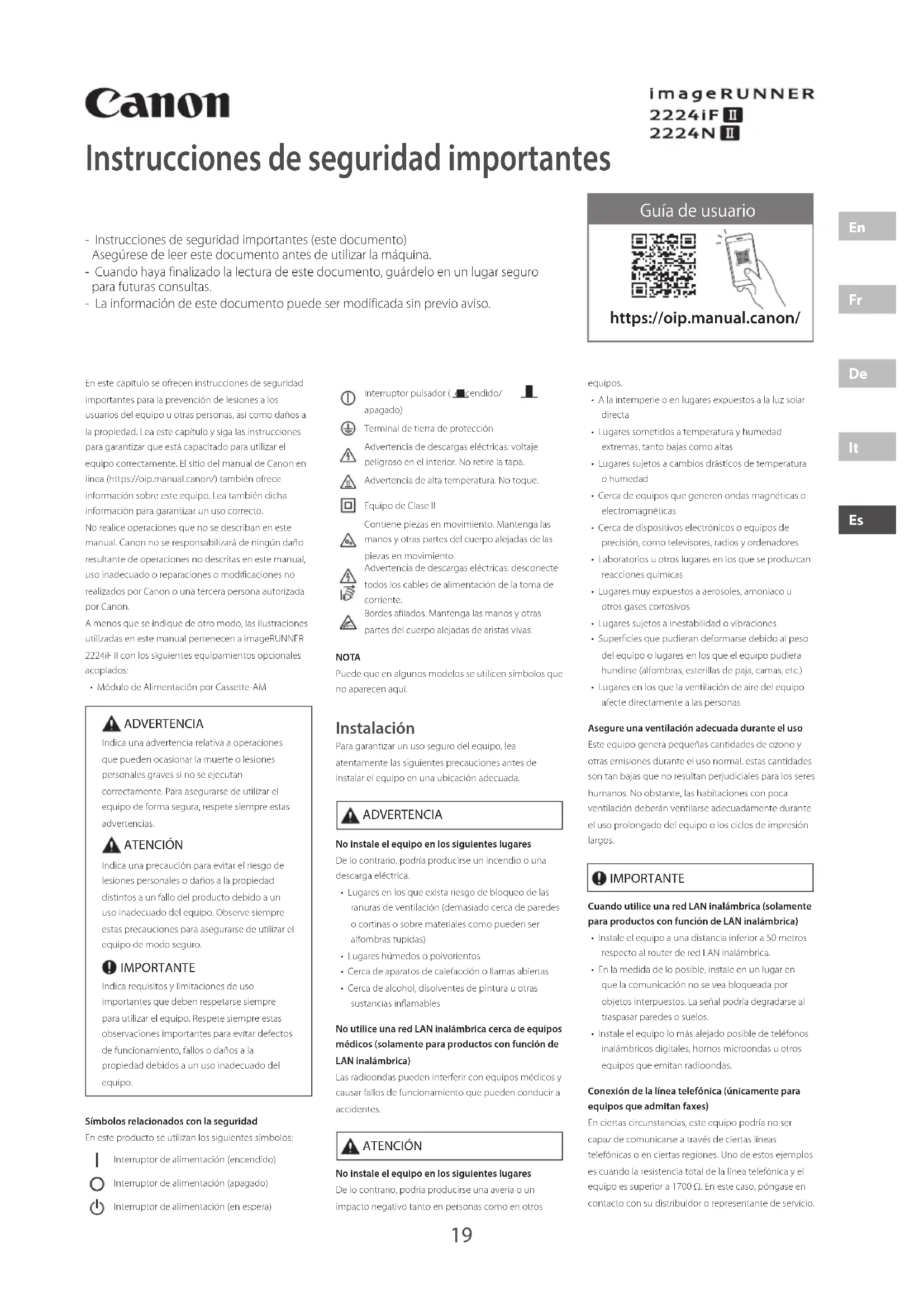 EsInstrucciones de seguridad importantes En este capítulo se ofrecen instrucciones de seguridad importantes para la prevención de lesiones a los usuarios del equipo u otras personas, así como daños a la propiedad. Lea este capítulo y siga las instrucciones para garantizar que está capacitado para utilizar el equipo correctamente. El sitio del manual de Canon en línea (https://oip.manual.canon/) también ofrece información sobre este equipo. Lea también dicha información para garantizar un uso correcto. No realice operaciones que no se describan en este manual. Canon no se responsabilizará de ningún daño resultante de operaciones no descritas en este manual, uso inadecuado o reparaciones o modificaciones no realizados por Canon o una tercera persona autorizada por Canon.A menos que se indique de otro modo, las ilustraciones utilizadas en este manual pertenecen a imageRUNNER 2224iF II con los siguientes equipamientos opcionales acoplados:• Módulo de Alimentación por Cassette-AM ADVERTENCIA Indica una advertencia relativa a operaciones que pueden ocasionar la muerte o lesiones personales graves si no se ejecutan correctamente. Para asegurarse de utilizar el equipo de forma segura, respete siempre estas advertencias. ATENCIÓN Indica una precaución para evitar el riesgo de lesiones personales o daños a la propiedad distintos a un fallo del producto debido a un uso inadecuado del equipo. Observe siempre estas precauciones para asegurarse de utilizar el equipo de modo seguro. IMPORTANTE Indica requisitos y limitaciones de uso importantes que deben respetarse siempre para utilizar el equipo. Respete siempre estas observaciones importantes para evitar defectos de funcionamiento, fallos o daños a la propiedad debidos a un uso inadecuado del equipo.Símbolos relacionados con la seguridadEn este producto se utilizan los siguientes símbolos:Interruptor de alimentación (encendido)Interruptor de alimentación (apagado)Interruptor de alimentación (en espera)Interruptor pulsador ( encendido/ apagado)Terminal de tierra de protecciónAdvertencia de descargas eléctricas: voltaje peligroso en el interior. No retire la tapa.Advertencia de alta temperatura. No toque.Equipo de Clase IIContiene piezas en movimiento. Mantenga las manos y otras partes del cuerpo alejadas de las piezas en movimiento.Advertencia de descargas eléctricas: desconecte todos los cables de alimentación de la toma de corriente.Bordes afilados. Mantenga las manos y otras partes del cuerpo alejadas de aristas vivas. NOTA Puede que en algunos modelos se utilicen símbolos que no aparecen aquí. Instalación Para garantizar un uso seguro del equipo, lea atentamente las siguientes precauciones antes de instalar el equipo en una ubicación adecuada. ADVERTENCIA No instale el equipo en los siguientes lugaresDe lo contrario, podría producirse un incendio o una descarga eléctrica.• Lugares en los que exista riesgo de bloqueo de las ranuras de ventilación (demasiado cerca de paredes o cortinas o sobre materiales como pueden ser alfombras tupidas)• Lugares húmedos o polvorientos• Cerca de aparatos de calefacción o llamas abiertas• Cerca de alcohol, disolventes de pintura u otras sustancias inamablesNo utilice una red LAN inalámbrica cerca de equipos médicos (solamente para productos con función de LAN inalámbrica)Las radioondas pueden interferir con equipos médicos y causar fallos de funcionamiento que pueden conducir a accidentes. ATENCIÓN No instale el equipo en los siguientes lugaresDe lo contrario, podría producirse una avería o un impacto negativo tanto en personas como en otros equipos.• A la intemperie o en lugares expuestos a la luz solar directa• Lugares sometidos a temperatura y humedad extremas, tanto bajas como altas• Lugares sujetos a cambios drásticos de temperatura o humedad• Cerca de equipos que generen ondas magnéticas o electromagnéticas• Cerca de dispositivos electrónicos o equipos de precisión, como televisores, radios y ordenadores• Laboratorios u otros lugares en los que se produzcan reacciones químicas• Lugares muy expuestos a aerosoles, amoniaco u otros gases corrosivos• Lugares sujetos a inestabilidad o vibraciones• Supercies que pudieran deformarse debido al peso del equipo o lugares en los que el equipo pudiera hundirse (alfombras, esterillas de paja, camas, etc.)• Lugares en los que la ventilación de aire del equipo afecte directamente a las personasAsegure una ventilación adecuada durante el usoEste equipo genera pequeñas cantidades de ozono y otras emisiones durante el uso normal. estas cantidades son tan bajas que no resultan perjudiciales para los seres humanos. No obstante, las habitaciones con poca ventilación deberán ventilarse adecuadamente durante el uso prolongado del equipo o los ciclos de impresión largos. IMPORTANTE Cuando utilice una red LAN inalámbrica (solamente para productos con función de LAN inalámbrica)• Instale el equipo a una distancia inferior a 50 metros respecto al router de red LAN inalámbrica. • En la medida de lo posible, instale en un lugar en que la comunicación no se vea bloqueada por objetos interpuestos. La señal podría degradarse al traspasar paredes o suelos. • Instale el equipo lo más alejado posible de teléfonos inalámbricos digitales, hornos microondas u otros equipos que emitan radioondas.Conexión de la línea telefónica (únicamente para equipos que admitan faxes)En ciertas circunstancias, este equipo podría no ser capaz de comunicarse a través de ciertas líneas telefónicas o en ciertas regiones. Uno de estos ejemplos es cuando la resistencia total de la línea telefónica y el equipo es superior a 1700Ω. En este caso, póngase en contacto con su distribuidor o representante de servicio. - Instrucciones de seguridad importantes (este documento) Asegúrese de leer este documento antes de utilizar la máquina. - Cuando haya finalizado la lectura de este documento, guárdelo en un lug