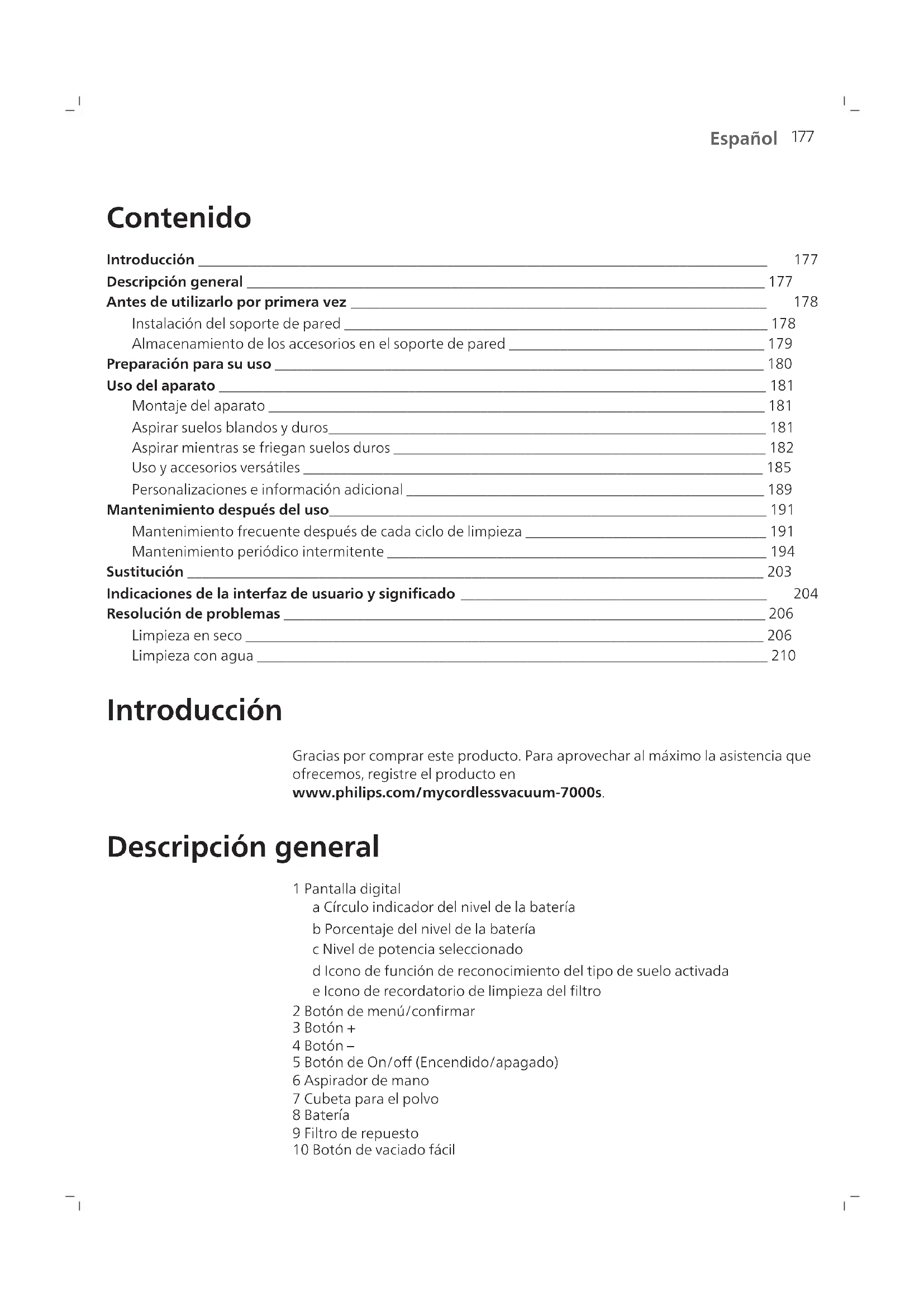 Español Español Contenido Introducción ______________________________________________________________________________ 177 Descripción general _______________________________________________________________________ 177 Antes de utilizarlo por primera vez _________________________________________________________ 178 Instalación del soporte de pared __________________________________________________________ 178 Almacenamiento de los accesorios en el soporte de pared ___________________________________ 179 Preparación para su uso ___________________________________________________________________ 180 Uso del aparato ___________________________________________________________________________ 181 Montaje del aparato ____________________________________________________________________ 181 Aspirar suelos blandos y duros____________________________________________________________ 181 Aspirar mientras se friegan suelos duros ___________________________________________________ 182 Uso y accesorios versátiles _______________________________________________________________ 185 Personalizaciones e información adicional _________________________________________________ 189 Mantenimiento después del uso____________________________________________________________ 191 Mantenimiento frecuente después de cada ciclo de limpieza _________________________________ 191 Mantenimiento periódico intermitente ____________________________________________________ 194 Sustitución _______________________________________________________________________________ 203 Indicaciones de la interfaz de usuario y significado __________________________________________ 204 Resolución de problemas __________________________________________________________________ 206 Limpieza en seco _______________________________________________________________________ 206 Limpieza con agua ______________________________________________________________________ 210 Introducción Gracias por comprar este producto. Para aprovechar al máximo la asistencia que ofrecemos, registre el producto en www.philips.com/mycordlessvacuum-7000s. Descripción general 1 Pantalla digital a Círculo indicador del nivel de la batería b Porcentaje del nivel de la batería c Nivel de potencia seleccionado d Icono de función de reconocimiento del tipo de suelo activada e Icono de recordatorio de limpieza del filtro 2 Botón de menú/confirmar 3 Botón + 4 Botón – 5 Botón de On/off (Encendido/apagado) 6 Aspirador de mano 7 Cubeta para el polvo 8 Batería 9 Filtro de repuesto 10 Botón de vaciado fácil178 Español 11 Botón de liberación de la cubeta para el polvo 12 Adaptador de corriente 13 Tornillos 14 Montaje en pared 15 Tubo 16 Boquilla TriActive Smart LED 17 Cepillo para suelos delicados (solo XC7067) 18 Depósito de agua y almohadilla para fregar de microfibra (solo XC7163 y XC7167) 19 Boquilla PetPro 20 Herramienta de combinación 21 Cepillo suave (solo XC7065, XC7067 y XC7167) 22 Boquilla para tapicería (solo XC7065, XC7067 y XC6167) 23 Boquilla estrecha Antes de utilizarlo por primera vez Instalación del soporte de pared 1 Invierta el soporte de pared y desenganche la palanca gris. Inserte el puerto de carga, asegurándose de que la parte metálica se vea y apunte hacia arriba en el lado frontal del soporte de pared. 2 Doble y meta el cable en su ranura correspondiente. 3 Cierre la palanca gris. Asegúrese de que la palanca gris esté trabada en su lugar, lo que irá acompañado del sonido de un "CLIC".179 Español 110 ± 2 cm 4 Fije el soporte de pared en el sitio de la pared que prefiera, asegurándose de que los agujeros de los tornillos de montaje estén aproximadamente a 110 cm del suelo. Precaución: Cuando haga los agujeros en la pared para fijar el soporte de pared, tenga cuidado de evitar riesgos de descargas eléctricas. Nota: Compruebe si el lugar de colocación del soporte de pared permite que el aparato entero cuelgue de la pared sin que la boquilla entre en contacto con el suelo. 5 Una vez que haya decidido la posición y la altura óptima para guardar y cargar el aparato, apriete firmemente los tornillos para fijar el soporte de pared. Almacenamiento de los accesorios en el soporte de pared Todos los accesorios se pueden guardar en el soporte de pared, excepto la combinación de la boquilla PetPro y la herramienta para tapicería. Nota: Ten cuidado porque la boquilla PetPro y la herramienta para tapicería no se pueden guardar juntas en el soporte de pared.180 Español Preparación para su uso Este aparato está equipado con una batería de iones de litio. La carga completa de la batería tarda unas 6 horas. 1 Acople el paquete de baterías a la carcasa principal del aparato, asegurándose de que la conexión sea segura, lo que se confirmará con el sonido de un "CLIC".