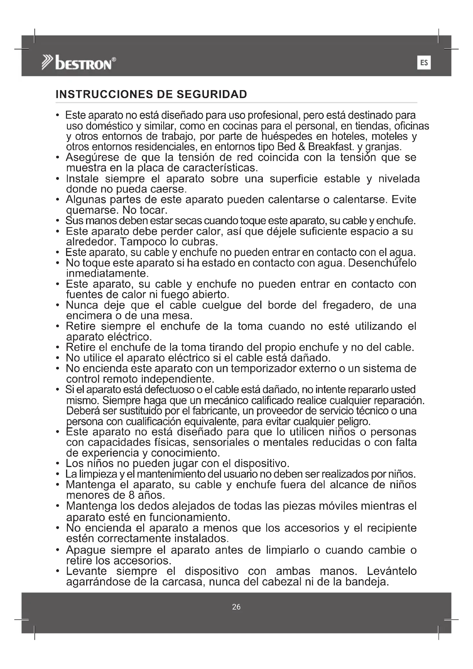 - Su municipio puede indicarle dónde encontrar el punto de recogida de residuos designado en su barrio. SERVICIO En el improbable caso de que se produzca un mal funcionamiento, póngase en contacto con el servicio de atención al cliente de Bestron: www.bestron.com/service FUNCIONAMIENTO - Generalidades La siguiente descripción corresponde a la imagen de la página 2.