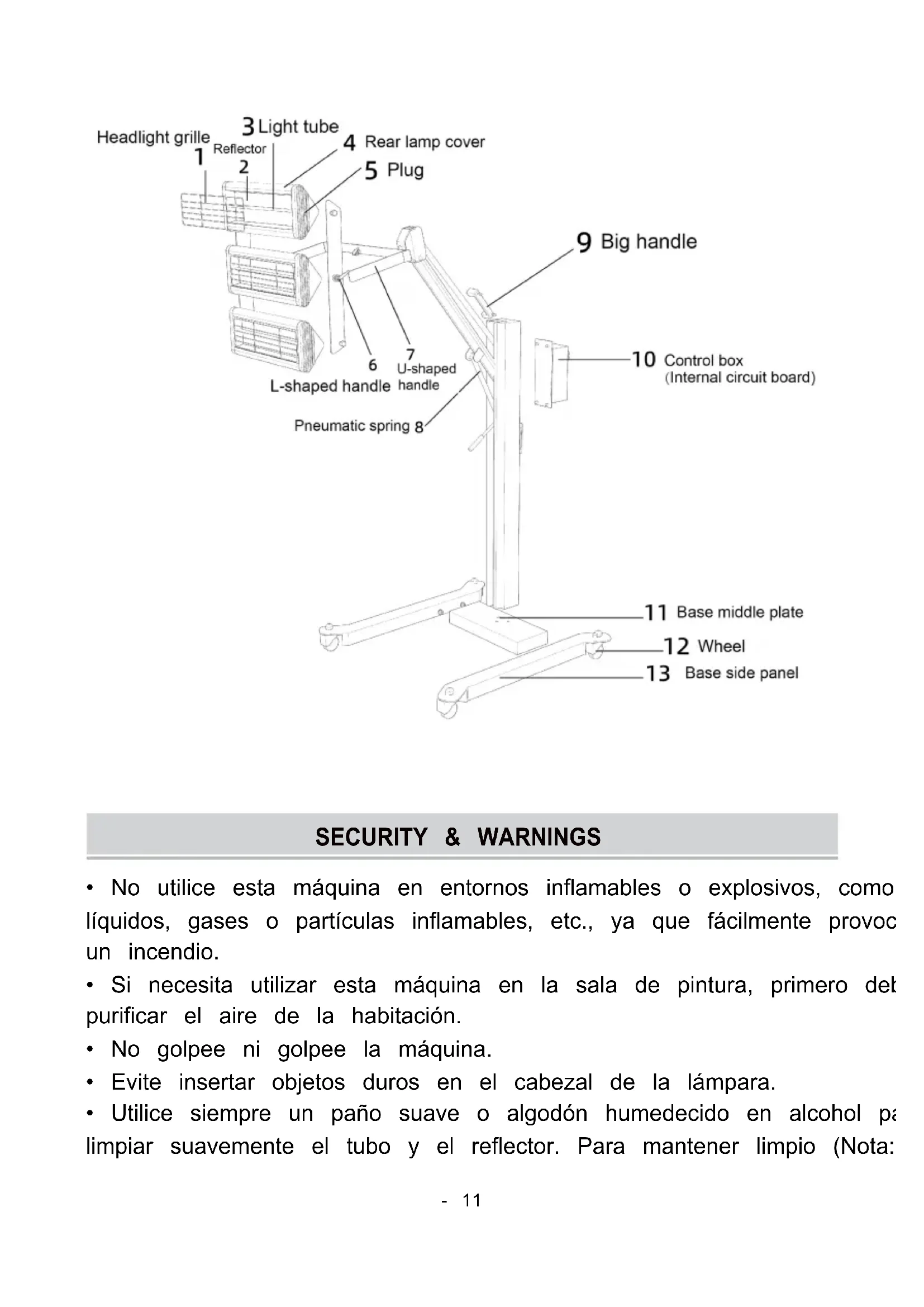 Caja A: 1 juego de portalámparas (incluye 3 tubos de lámpara ensamblados en uno); Caja B: 1 juego de sistema de control de columna 1 juego de base Manijas ajustables *3 (con 2 arandelas y 1 tornillo) Esquinas hexagonales interiores *2 Ruedas *4 (2 con freno / 2 móviles) Mango *2- 6 -- 7 -- 8 -- 9 -- 10 -- 11 - SECURITY & WARNINGS