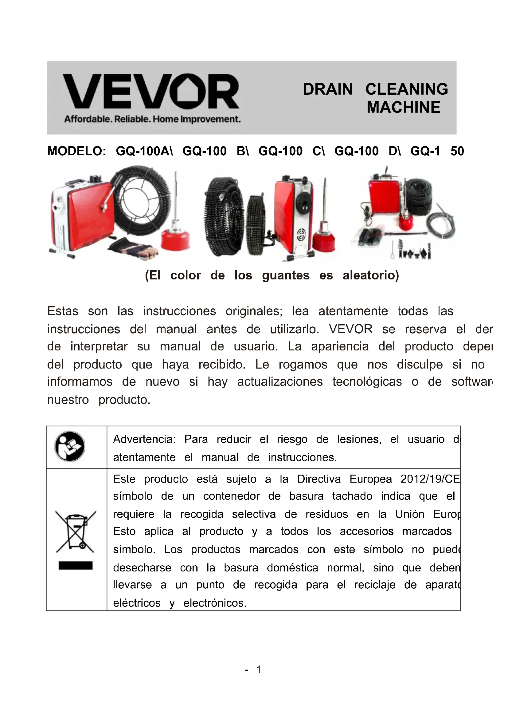 GQ-100 B GQ-100 C GQ-100 D GQ-150- 1 - MODELO: GQ-100A\ GQ-100 B\ GQ-100 C\ GQ-100 D\ GQ-1 50 (El color de los guantes es aleatorio) Estas son las instrucciones originales; lea atentamente todas las instrucciones del manual antes de utilizarlo. VEVOR se reserva el derecho de interpretar su manual de usuario. La apariencia del producto dependerá del producto que haya recibido. Le rogamos que nos disculpe si no le informamos de nuevo si hay actualizaciones tecnológicas o de software en nuestro producto. Advertencia: Para reducir el riesgo de lesiones, el usuario debe leer atentamente el manual de instrucciones. Este producto está sujeto a la Directiva Europea 2012/19/CE. El símbolo de un contenedor de basura tachado indica que el producto requiere la recogida selectiva de residuos en la Unión Europea. Esto aplica al producto y a todos los accesorios marcados con este símbolo. Los productos marcados con este símbolo no pueden desecharse con la basura doméstica normal, sino que deben llevarse a un punto de recogida para el reciclaje de aparatos eléctricos y electrónicos. DRAIN CLEANING MACHINE- 2 - Este símbolo indica que al utilizar la máquina, utilice siempre gafas de seguridad con placas protectoras y funciones de protección para los ojos para reducir el riesgo de lesiones oculares. Este símbolo indica el peligro de que las manos, los dedos u otras partes del cuerpo queden atrapadas en el cable de la máquina draga. El símbolo indica el peligro de quedar involucrado en la correa y la polea. El símbolo indica el peligro de sufrir una descarga eléctrica. INSTRUCCIONES Instrucciones de seguridad Lea atentamente todas las precauciones e instrucciones de seguridad. Si no las sigue, podría sufrir descargas eléctricas, incendios o lesiones graves. Conserve estas precauciones e instrucciones de seguridad. Precauciones de seguridad en el lugar de trabajo