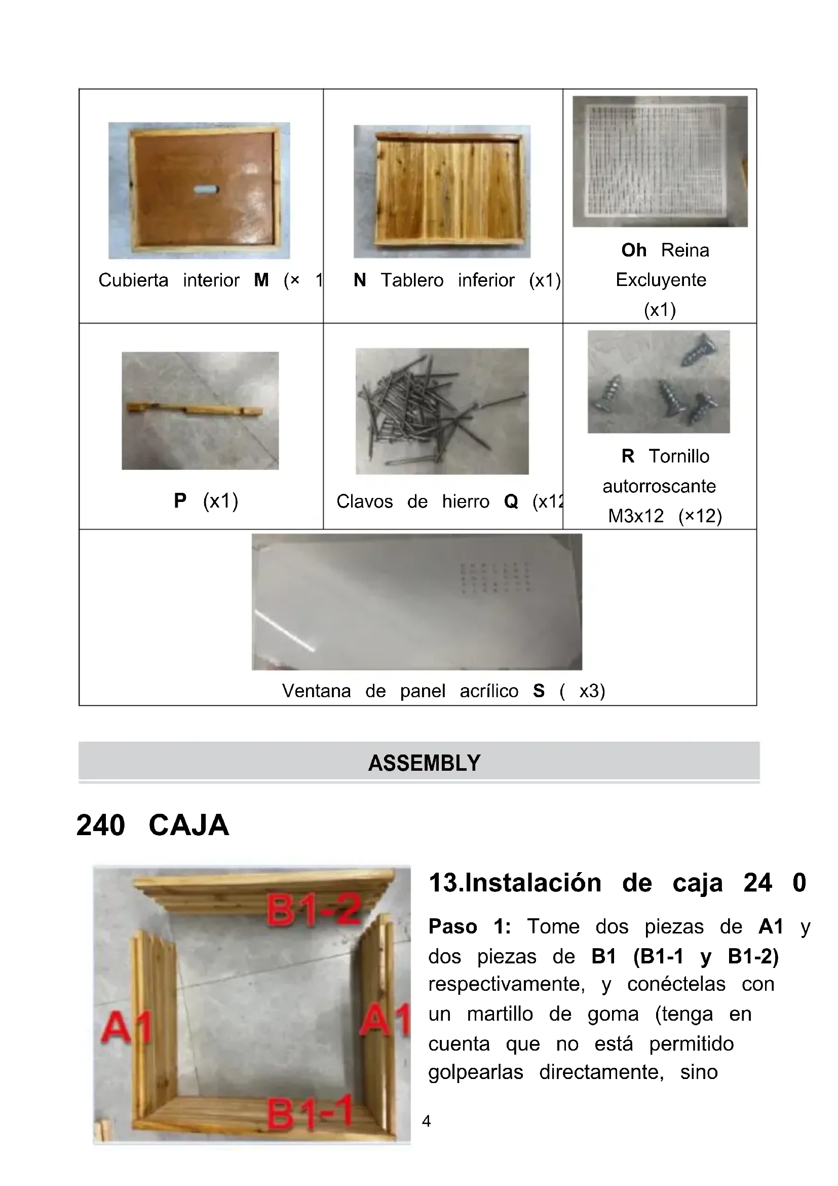 Yo -1 Yo -2 I Panel de ventana (×3) J Tornillo autorroscante M4x20 (×6) K Tablón pequeño (×6) L Cubierta superior (× 1 )- 4 - Cubierta interior M (× 1 ) N Tablero inferior (x1) Oh Reina Excluyente (x1) P (x1) Clavos de hierro Q (x120) R Tornillo autorroscante M3x12 (×12) Ventana de panel acrílico S ( x3) ASSEMBLY 240 CAJA 13.Instalación de caja 24 0 Paso 1: Tome dos piezas de A1 y dos piezas de B1 (B1-1 y B1-2) respectivamente, y conéctelas con un martillo de goma (tenga en cuenta que no está permitido golpearlas directamente, sino- 5 - colocar una tabla o cartón sobre ellas y golpearlas uniformemente). 14.Instalación de marco 24 0 Paso 1: Tome 2 piezas de E1 y 1 pieza de C , insértelas en la ranura de la tarjeta para conectarlas, luego tome 1 pieza de F1 e insértela en la ranura, y finalmente tome 1 pieza de D e insértela en la ranura para completar un conjunto de 170 marcos. Paso 2: Conecta con 4 piezas de Q en las 4 posiciones a/b/c/d.- 6 - 15.Instalación de la ventana Paso 1: Tome G , H e I-1 para ensamblar la placa de cubierta. Paso 2: Tome S y retire la película de las esquinas, luego tome S y R para ensamblar el Coaming.- 7 - Paso 3: Tome J y K para ensamblar las placas de presión de la ventana en ambos lados y coloque 10 juegos de cimientos y marcos en la caja. 17 0 CAJA 16.Instalación de caja 170 Paso 1: Tome dos piezas de A2 y dos piezas de B2 (B2-1 y B2-2) respectivamente, y conéctelas con un martillo de goma (tenga en cuenta que no está permitido golpearlas directamente, sino colocar una tabla o cartón sobre ellas y golpearlas uniformemente).- 8 - 17.Instalación de marco 170 Paso 1: Tome 2 piezas de E2 y 1 pieza de C , insértelas en la ranura de la tarjeta para conectarlas, luego tome 1 pieza de F2 e insértela en la ranura, y finalmente tome 1 pieza de D e insértela en la ranura para completar un conjunto de 170 marcos. Paso 2: Conecta con 4 piezas de Q en las 4 posiciones a/b/c/d.- 9 - 18.Instalación de la ventana Paso 1: Tome G , H e I-2 para ensamblar la placa de cubierta. Paso 2: Tome N y retire la película de las esquinas, luego tome N y M para ensamblar el Coaming.- 10 - Paso 3: Tome J y K para ensamblar las placas de presión de la ventana en ambos lados y coloque 10 juegos de cimientos y marcos en la caja. Finalmente, realice el montaje según la siguiente figura: India Nombre