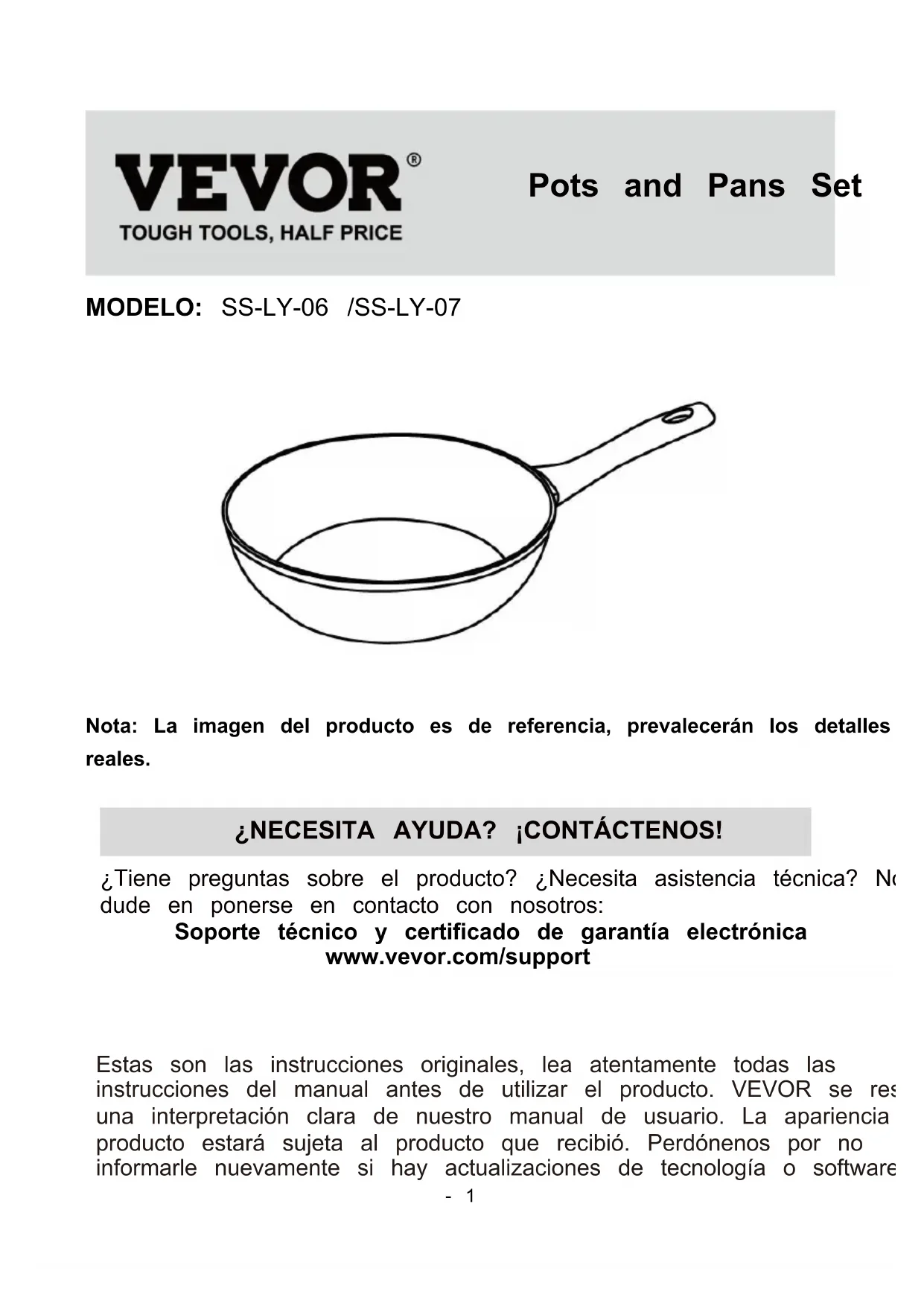 Nota: La imagen del producto es de referencia, prevalecerán los detalles reales. ¿NECESITA AYUDA? ¡CONTÁCTENOS! ¿Tiene preguntas sobre el producto? ¿Necesita asistencia técnica? No dude en ponerse en contacto con nosotros: Soporte técnico y certificado de garantía electrónica www.vevor.com/support Estas son las instrucciones originales, lea atentamente todas las instrucciones del manual antes de utilizar el producto. VEVOR se reserva una interpretación clara de nuestro manual de usuario. La apariencia del producto estará sujeta al producto que recibió. Perdónenos por no informarle nuevamente si hay actualizaciones de tecnología o software Pots and Pans Set- 2 - en nuestro producto. Operation safety ADVERTENCIA: Lea todas las instrucciones antes de utilizar este producto. Es responsabilidad del propietario asegurarse de que todos los usuarios de este producto conozcan plenamente todas las advertencias y precauciones.