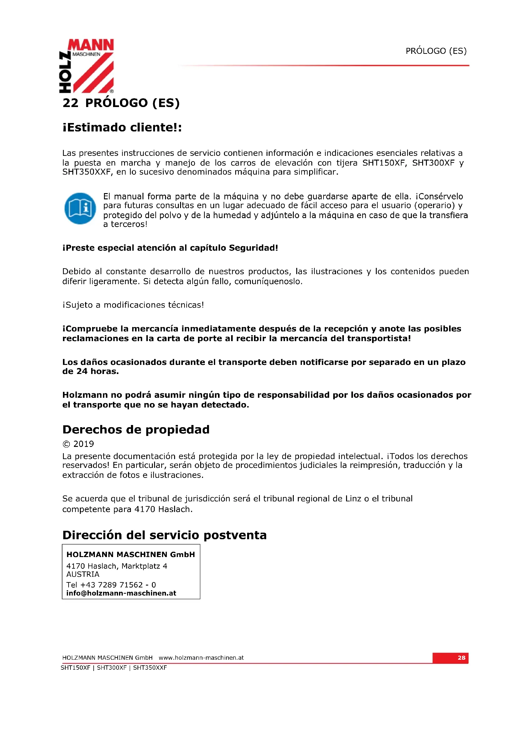 22 PRÓLOGO (ES) ¡Estimado cliente!: Las presentes instrucciones de servicio contienen información e indicaciones esenciales relativas a la puesta en marcha y manejo de los carros de elevación con tijera SHT150XF, SHT300XF y SHT350XXF, en lo sucesivo denominados máquina para simplificar. El manual forma parte de la máquina y no debe guardarse aparte de ella. ¡Consérvelo para futuras consultas en un lugar adecuado de fácil acceso para el usuario (operario) y protegido del polvo y de la humedad y adjúntelo a la máquina en caso de que la transfiera a terceros! ¡Preste especial atención al capítulo Seguridad! Debido al constante desarrollo de nuestros productos, las ilustraciones y los contenidos pueden diferir ligeramente. Si detecta algún fallo, comuníquenoslo. ¡Sujeto a modificaciones técnicas! ¡Compruebe la mercancía inmediatamente después de la recepción y anote las posibles reclamaciones en la carta de porte al recibir la mercancía del transportista! Los daños ocasionados durante el transporte deben notificarse por separado en un plazo de 24 horas. Holzmann no podrá asumir ningún tipo de responsabilidad por los daños ocasionados por el transporte que no se hayan detectado. Derechos de propiedad © 2019 La presente documentación está protegida por la ley de propiedad intelectual. ¡Todos los derechos reservados! En particular, serán objeto de procedimientos judiciales la reimpresión, traducción y la extracción de fotos e ilustraciones. Se acuerda que el tribunal de jurisdicción será el tribunal regional de Linz o el tribunal competente para 4170 Haslach. Dirección del servicio postventa HOLZMANN MASCHINEN GmbH 4170 Haslach, Marktplatz 4 AUSTRIA Tel +43 7289 71562 - 0 info@holzmann-maschinen.atSEGURIDAD