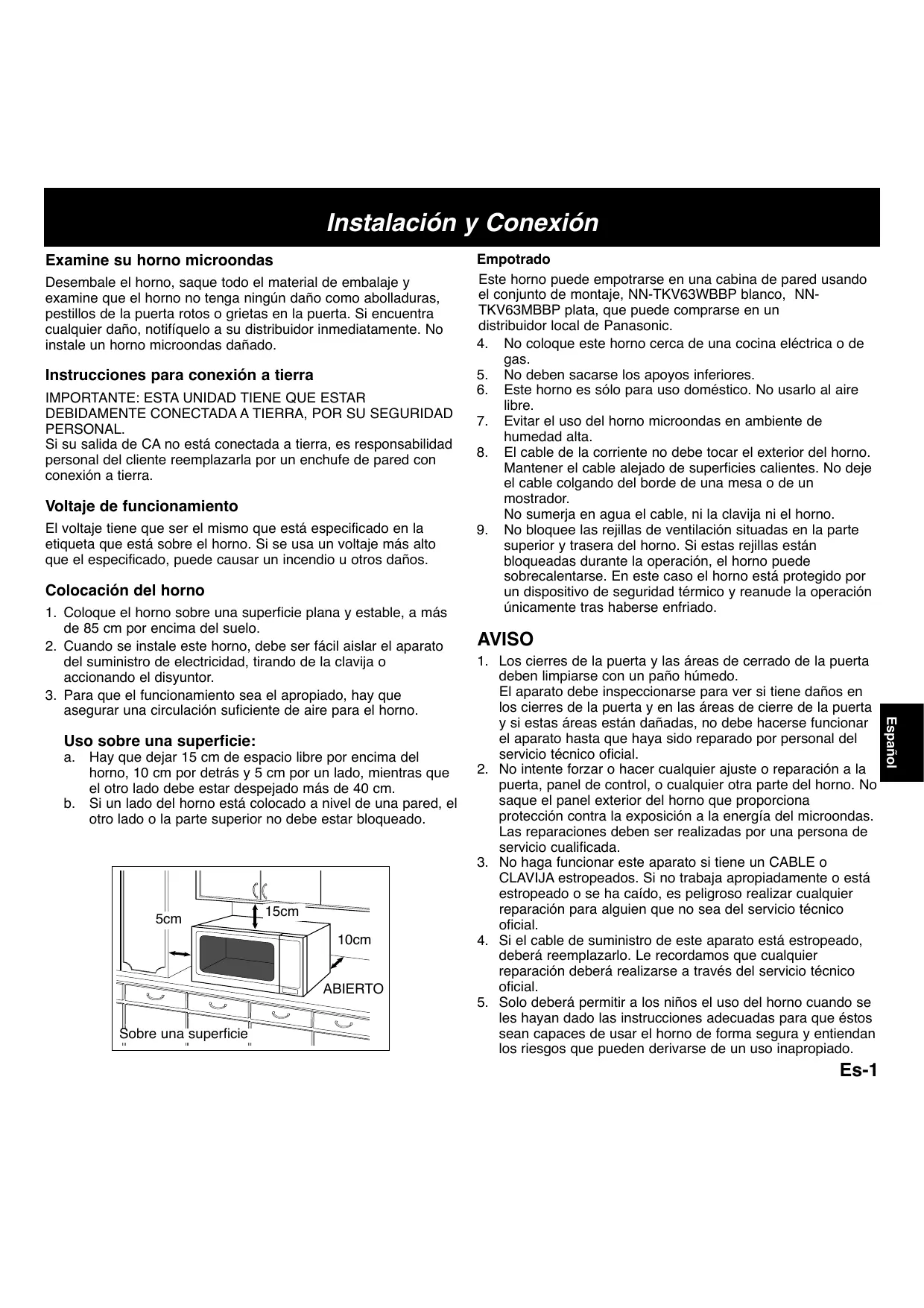 Este horno puede empotrarse en una cabina de pared usando el conjunto de montaje, NN-TKV63WBBP blanco, NNTKV63MBBP plata, que puede comprarse en un distribuidor local de Panasonic. 4. No coloque este horno cerca de una cocina eléctrica o de gas. 5. No deben sacarse los apoyos inferiores. 6. Este horno es sólo para uso doméstico. No usarlo al aire libre. 7. Evitar el uso del horno microondas en ambiente de humedad alta. 8. El cable de la corriente no debe tocar el exterior del horno. Mantener el cable alejado de superficies calientes. No deje el cable colgando del borde de una mesa o de un mostrador. No sumerja en agua el cable, ni la clavija ni el horno. 9. No bloquee las rejillas de ventilación situadas en la parte superior y trasera del horno. Si estas rejillas están bloqueadas durante la operación, el horno puede sobrecalentarse. En este caso el horno está protegido por un dispositivo de seguridad térmico y reanude la operación únicamente tras haberse enfriado.