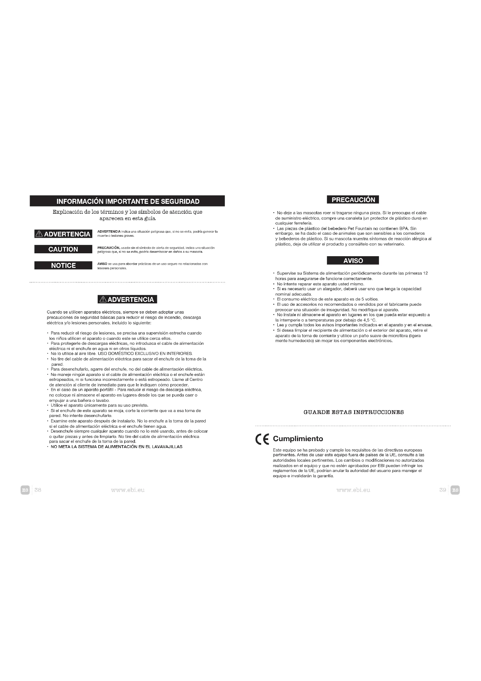 - No deje a las mascotas roer ni tragarse ninguna pieza. Si le preocupa el cable de suministro eléctrico, compre una canaleta (un protector de plástico duro) en cualquier ferretería.• Las piezas de plástico del bebedero Pet Fountain no contienen BPA. Sin embargo, se ha dado el caso de animales que son sensibles a los comederos y bebederos de plástico. Si su mascota muestra síntomas de reacción alérgica al plástico, deje de utilizar el producto y consúltelo con su veterinario.• Supervise su Sistema de alimentación periódicamente durante las primeras 12 horas para asegurarse de funcione correctamente.• No intente reparar este aparato usted mismo.• Si es necesario usar un alargador, deberá usar uno que tenga la capacidad nominal adecuada.• El consumo eléctrico de este aparato es de 5 voltios.• El uso de accesorios no recomendados o vendidos por el fabricante puede provocar una situación de inseguridad. No modique el aparato.• No instale ni almacene el aparato en lugares en los que pueda estar expuesto a la intemperie o a temperaturas por debajo de 4,5 °C.• Lea y cumpla todos los avisos importantes indicados en el aparato y en el envase.• Si desea limpiar el recipiente de alimentación o el exterior del aparato, retire el aparato de la toma de corriente y utilice un paño suave de microbra (ligera mente humedecido) sin mojar los componentes electrónicos.
