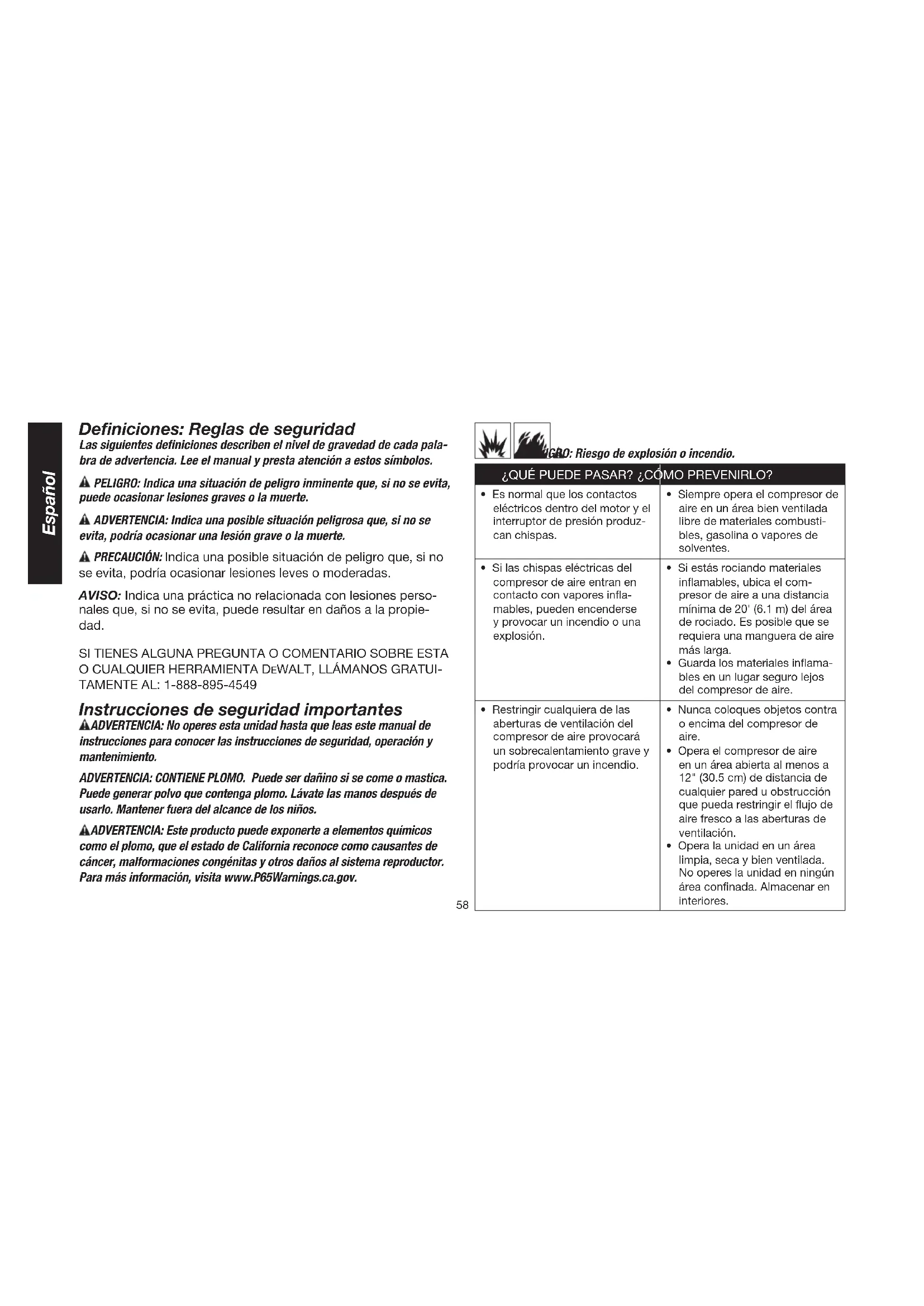 Instrucciones de seguridad importantes ADVERTENCIA: No operes esta unidad hasta que leas este manual de instrucciones para conocer las instrucciones de seguridad, operación y mantenimiento. ADVERTENCIA: CONTIENE PLOMO. Puede ser dañino si se come o mastica. Puede generar polvo que contenga plomo. Lávate las manos después de usarlo. Mantener fuera del alcance de los niños. ADVERTENCIA: Este producto puede exponerte a elementos químicos como el plomo, que el estado de California reconoce como causantes de cáncer, malformaciones congénitas y otros daños al sistema reproductor. Para más información, visita www.P65Warnings.ca.gov. PELIGRO: Riesgo de explosión o incendio. ¿QUÉ PUEDE PASAR? ¿CÓMO PREVENIRLO?