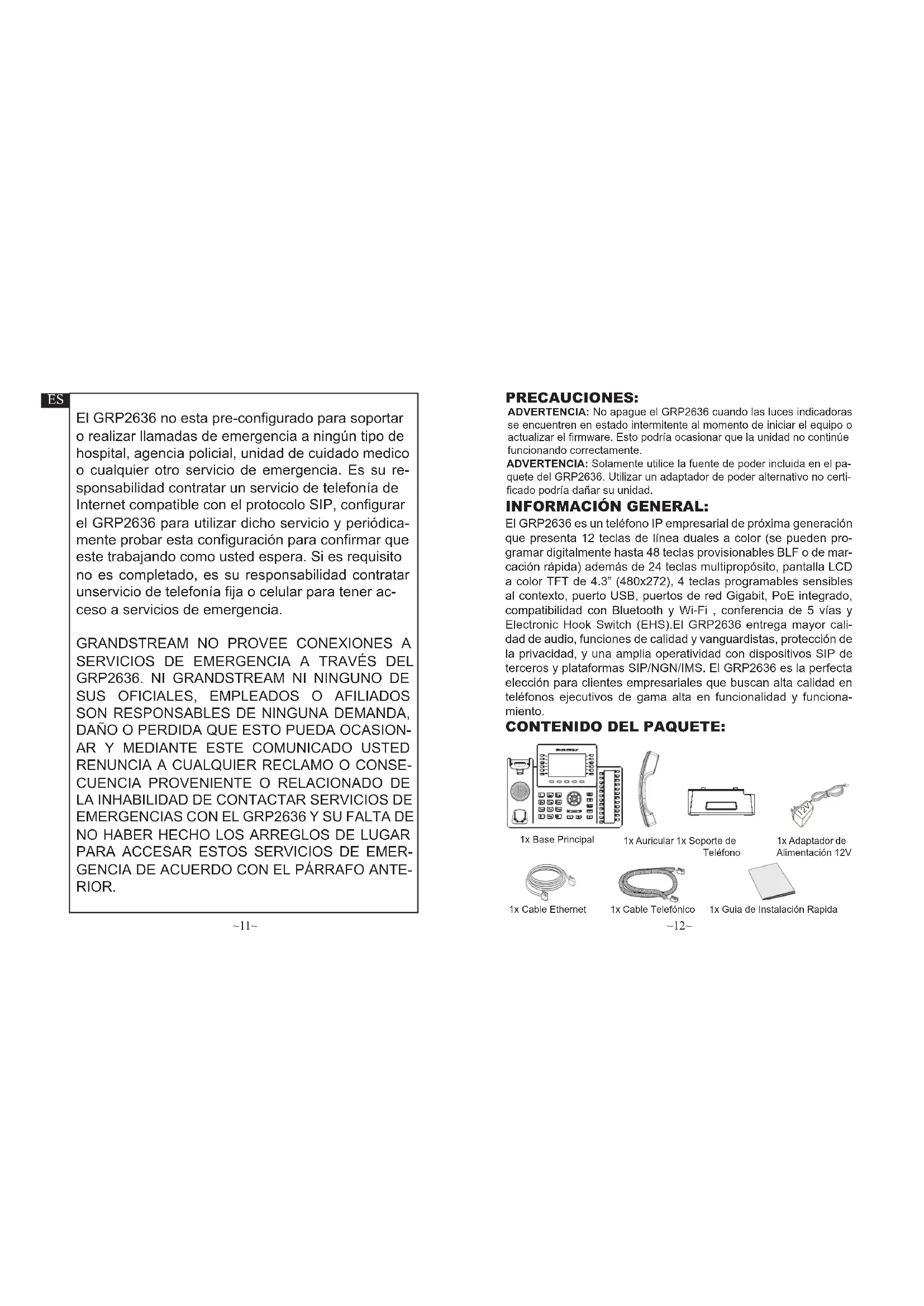 请下载用户手册和常见问题解答以获得更详细的配置说明: https://www.grandstream.com/our-products GNU GPL许可条款已包含在设备固件中,可以通过设备的Web用户界面进行访 问:http(s)://IP/gpl_license。 如果需要包含GPL源代码信息的CD,请发邮件到info@grandstream.com 提交请求 。~11~ ~12~ El GRP2636 no esta pre-configurado para soportar o realizar llamadas de emergencia a ningún tipo de hospital, agencia policial, unidad de cuidado medico o cualquier otro servicio de emergencia. Es su re- sponsabilidad contratar un servicio de telefonía de Internet compatible con el protocolo SIP, configurar el GRP2636 para utilizar dicho servicio y periódica- mente probar esta configuración para confirmar que este trabajando como usted espera. Si es requisito no es completado, es su responsabilidad contratar unservicio de telefonía fija o celular para tener ac- ceso a servicios de emergencia.