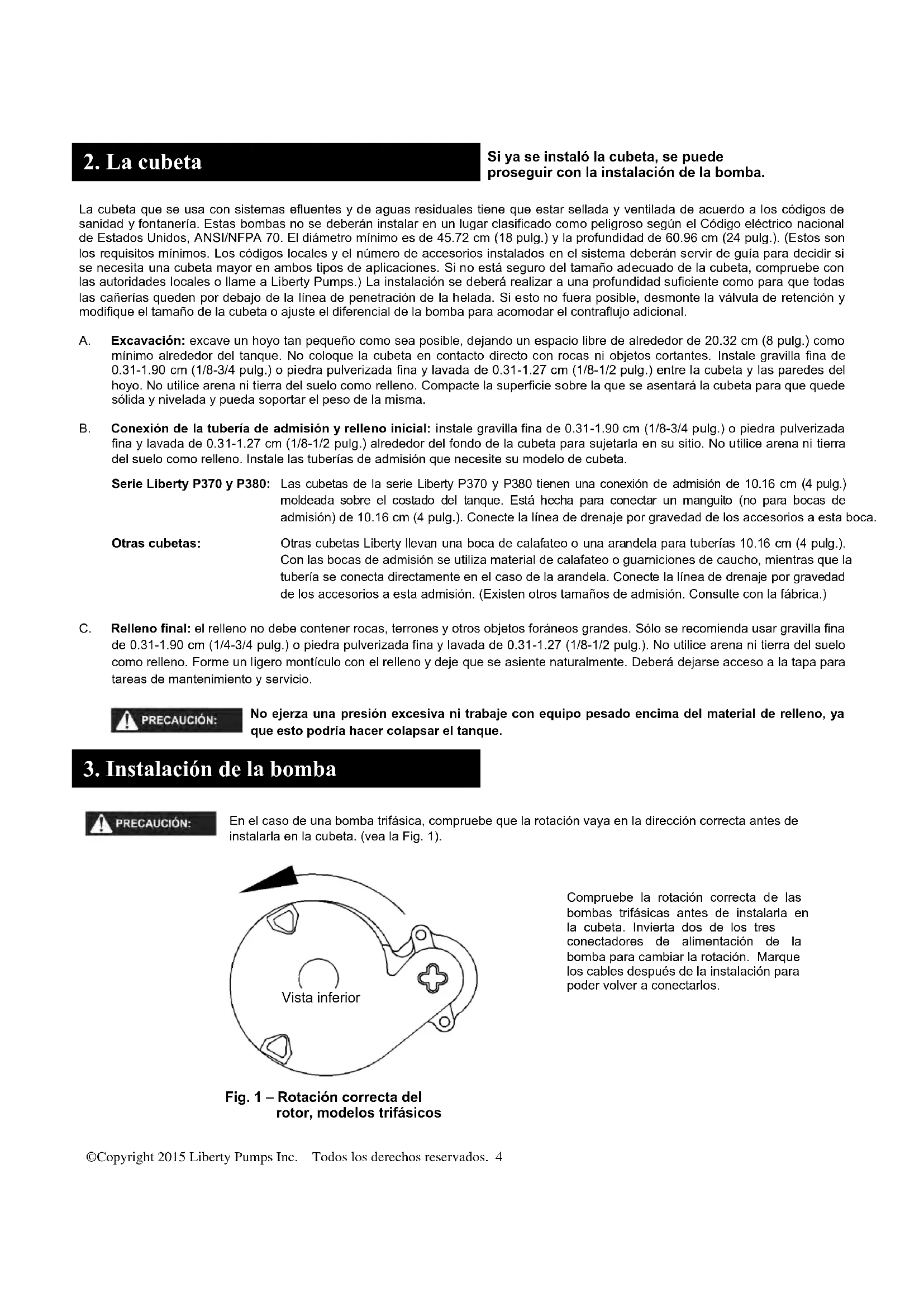 Compruebe la rotación correcta de las bombas trifásicas antes de instalarla en la cubeta. Invierta dos de los tres conectadores de alimentación de la bomba para cambiar la rotación. Marque los cables después de la instalación para poder volver a conectarlos. Vista inferior Fig. 1 – Rotación correcta del rotor, modelos trifásicos©Copyright 2015 Liberty Pumps Inc. Todos los derechos reservados. 5 Fig. 3 – Instalación típica de un sistema doble Esta es solo la instalación recomendada. Pueden presentarse variaciones. Fig. 2 – Instalación típica de un sistema simple Esta es solo la instalación recomendada. Pueden presentarse variaciones. Los sistemas de aguas residuales preensamblados de Liberty vienen con la bomba ya montada en la cubeta. La tubería, o tuberías, de desagüe ya sale de la tapa y se puede conectar de inmediato a la línea de desagüe. Si su sistema está preensamblado, se puede saltar los pasos A y B que siguen a continuación. A. Sistemas simples (una bomba) (vea la Fig. 2): Instale la bomba de forma que haya espacio suficiente entre las paredes de la cubeta y el flotador. Si se va a utilizar un flotador o dispositivo de control siga las instrucciones que lo acompañan. El nivel mínimo de apagado de la bomba no se debe fijar por debajo de los 15.24 cm (6 pulg.). Conecte la tubería de descarga a la salida roscada de la bomba. IMPORTANTE: no reduzca el tamaño de la tubería de desagüe por debajo del tamaño de la salida de la bomba. En las bombas de aguas residuales no debe ser inferior a 5.08 cm (2 pulg.). En ciertos casos hará falta aumentar el tamaño de la tubería para reducir las pérdidas por fricción. Comuníquese con Liberty Pumps o con una persona calificada si tiene preguntas sobre el tamaño de las tuberías y caudal apropiados. Monte la tapa en la cubeta y séllela bien. (Esta es sólo la instalación recomendada. Pueden presentarse variaciones).
