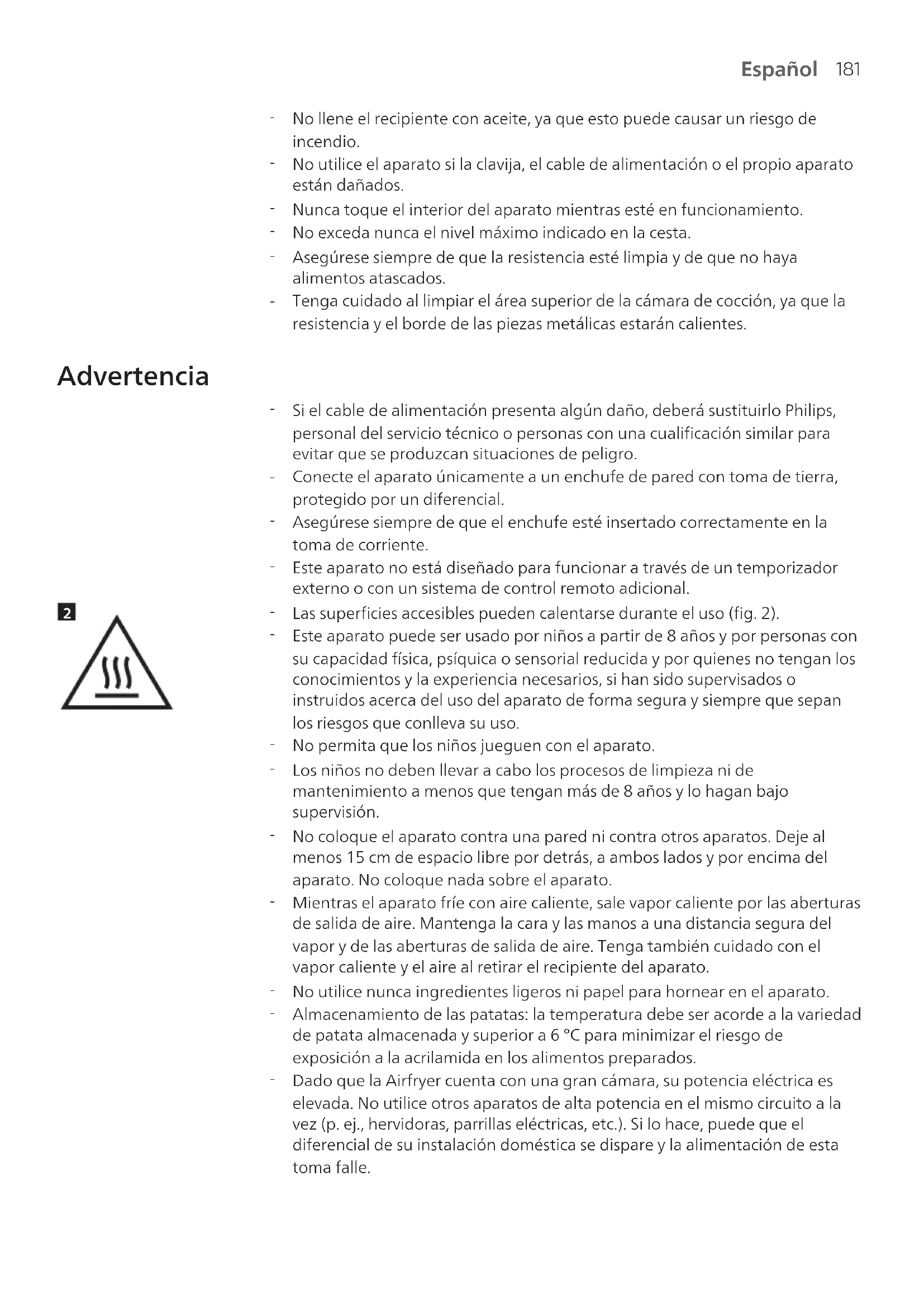 Dado que la Airfryer cuenta con una gran cámara, su potencia eléctrica es elevada. No utilice otros aparatos de alta potencia en el mismo circuito a la vez (p.ej., hervidoras, parrillas eléctricas, etc.). Si lo hace, puede que el diferencial de su instalación doméstica se dispare y la alimentación de esta toma falle.182 Español