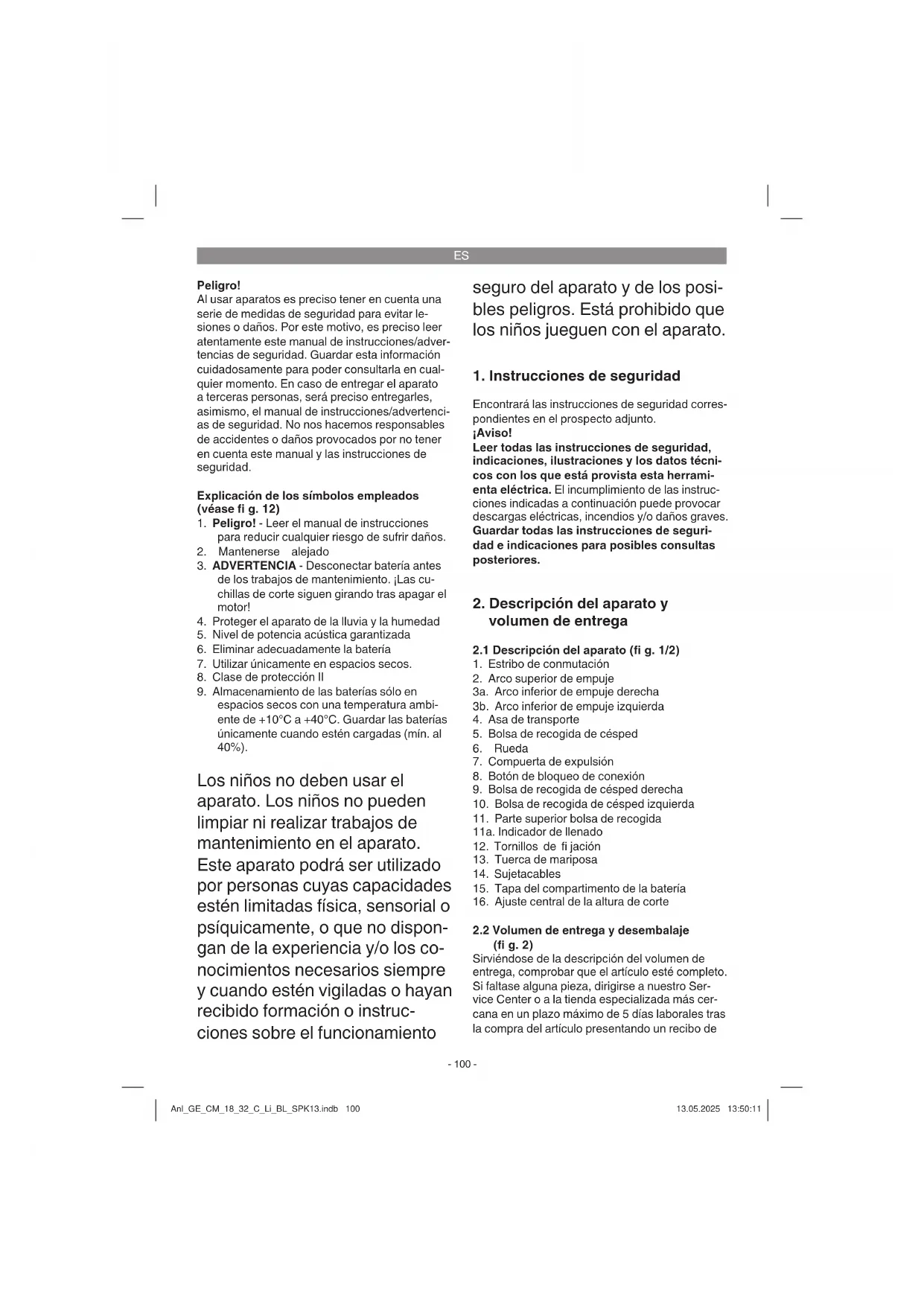 (fi g. 2) Sirviéndose de la descripción del volumen de entrega, comprobar que el artículo esté completo. Si faltase alguna pieza, dirigirse a nuestro Ser- vice Center o a la tienda especializada más cer- cana en un plazo máximo de 5 días laborales tras la compra del artículo presentando un recibo de Anl_GE_CM_18_32_C_Li_BL_SPK13.indb 100Anl_GE_CM_18_32_C_Li_BL_SPK13.indb 100 13.05.2025 13:50:1113.05.2025 13:50:11ES