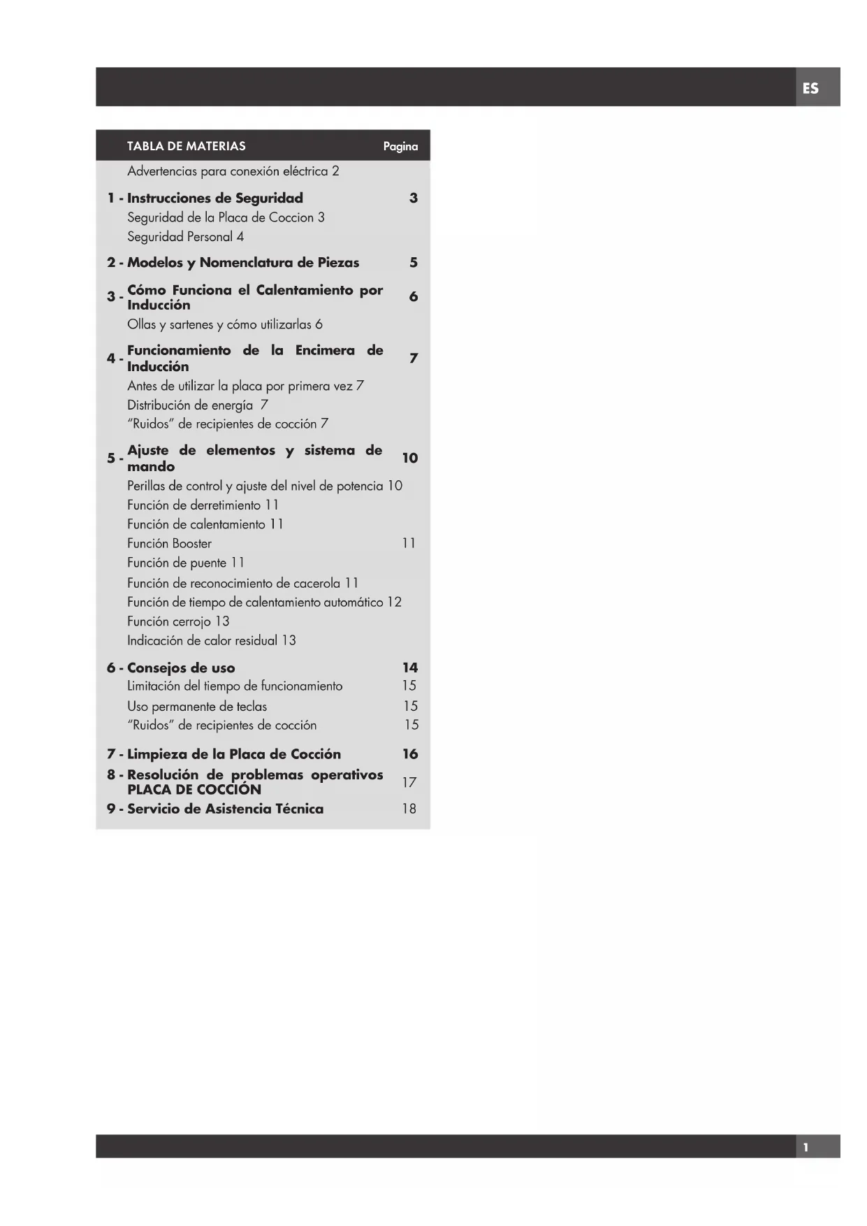 Seguridad de la Placa de Coccion ADVERTENCIA Instalación Adecuada• El electrodoméstico debe ser instalado y conectado a tierra por un electricista cualificado.No Utilice Jamás El Electrodoméstico Para Calentar Una Habitación. No Deje A Los Niños Solos • No deje a niños solos o sin supervisión en una habitación en la que haya electrodomésticos en funcionamiento. No permita que se suban o se sienten en ninguna parte del electrodoméstico.Lleve Ropa Adecuada • No lleve nunca ropa demasiado amplia o con mangas o complementos que cuelguen mientras use el electrodoméstico. Mantenimiento • No repare ni sustituya ningún componente del electrodoméstico si no se recomienda explícitamente en este manual. Cualquier otra operación debe ser efectuada por un técnico cualificado.Almacenamiento En El Interior Y Encima Del Electrodoméstico • No almacene materiales inflamables dentro de un horno ni cerca de las unidades de superficie.No Utilice Agua Para Sofocar Los Incendios Provocados Por Grasa• Sofoque las llamas con una tapa, bandeja o un extintor de polvo químico o de espuma. No Utilice Agarradores Húmedos• Si los agarradores entran en contacto con una superficie caliente, el vapor resultante podría provocar quemaduras. No utilice toallas o trapos gruesos o doblados. ADVERTENCIA No Deje El Electrodoméstico Desatendido Si Está Utilizando Temperaturas Elevadas • Las salpicaduras provocan humo y, si se derrama grasa, puede prender fuego.• No coloque objetos metálicos como cuchillos, tenedores, cucharas, y tapas sobre la superficie de las placas de cocción ya que pueden calentarseNo Utilice La Placa De Cocción Si Tiene Fisuras• Si la placa de cocción se rompiera, los limpiadores y los derrames de alimentos podrían filtrarse por las fisuras y provocar un riesgo de descarga eléctrica. Si detecta alguna fisura, póngase de inmediato en contacto con un técnico cualificado.Limpie La Placa Con Cuidado • Si utiliza una esponja o un trapo mojados para limpiar salpicaduras de la placa en caliente, hágalo con cuidado: podría quemarse con el vapor. Algunos productos de limpieza emanan vapores tóxicos si se aplican a una superficie caliente. INSTRUCCIONES IMPORTANTE Por favor, lea todas las instrucciones antes de utilizar este aparatoES