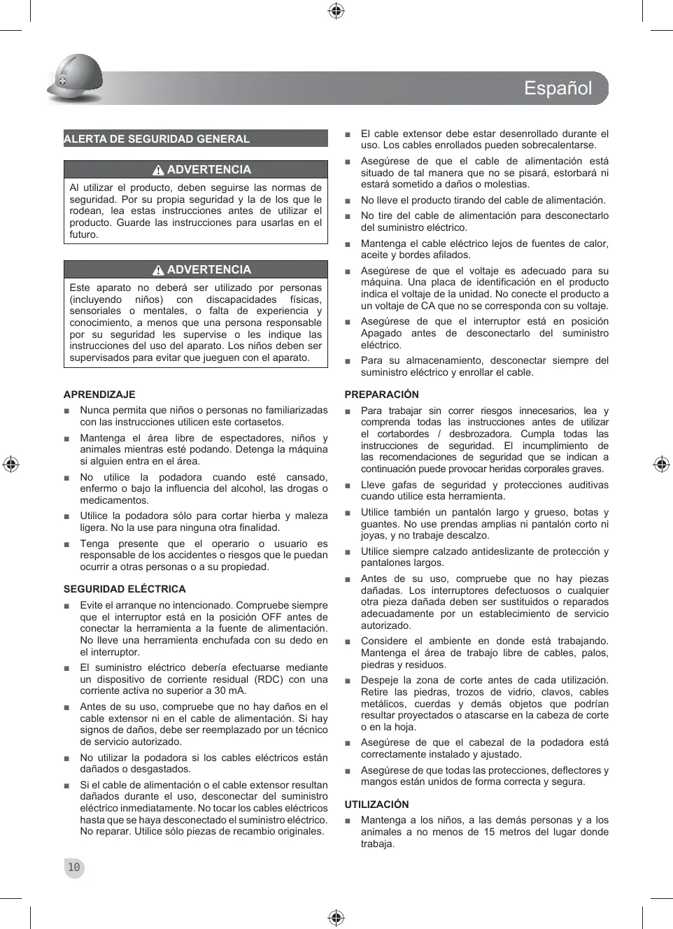 No utilice la podadora cuando esté cansado, enfermo o bajo la influencia del alcohol, las drogas o medicamentos. Para trabajar sin correr riesgos innecesarios, lea y comprenda todas las instrucciones antes de utilizar el cortabordes / desbrozadora. Cumpla todas las instrucciones de seguridad. El incumplimiento de las recomendaciones de seguridad que se indican a continuación puede provocar heridas corporales graves.