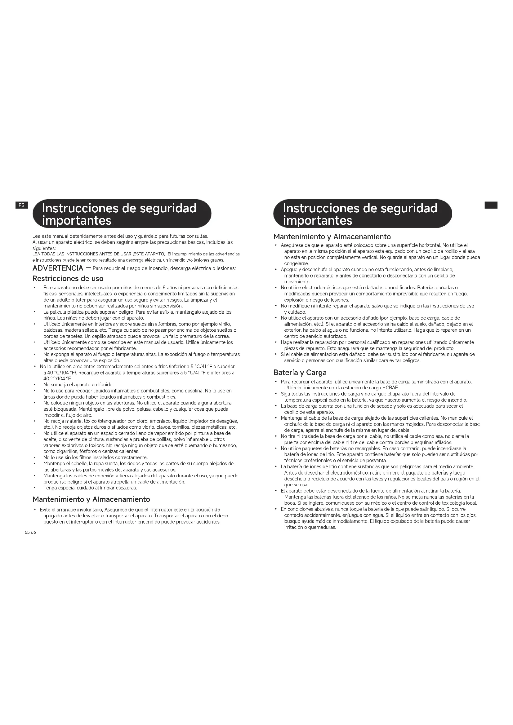 - Quando l'apparecchio è completamente carico, entra automaticamente in modalità standby dopo 10 minuti, con un consumo energetico di 0,8 W (con standby di rete) o 0,4 W (senza standby di rete).65 66 ES ES Instrucciones de seguridad importantes Instrucciones de seguridad importantes Lea este manual detenidamente antes del uso y guárdelo para futuras consultas. Al usar un aparato eléctrico, se deben seguir siempre las precauciones básicas, incluidas las siguientes: LEA TODAS LAS INSTRUCCIONES ANTES DE USAR (ESTE APARATO). El incumplimiento de las advertencias e instrucciones puede tener como resultado una descarga eléctrica, un incendio y/o lesiones graves. Para reducir el riesgo de incendio, descarga eléctrica o lesiones: ADVERTENCIA —
