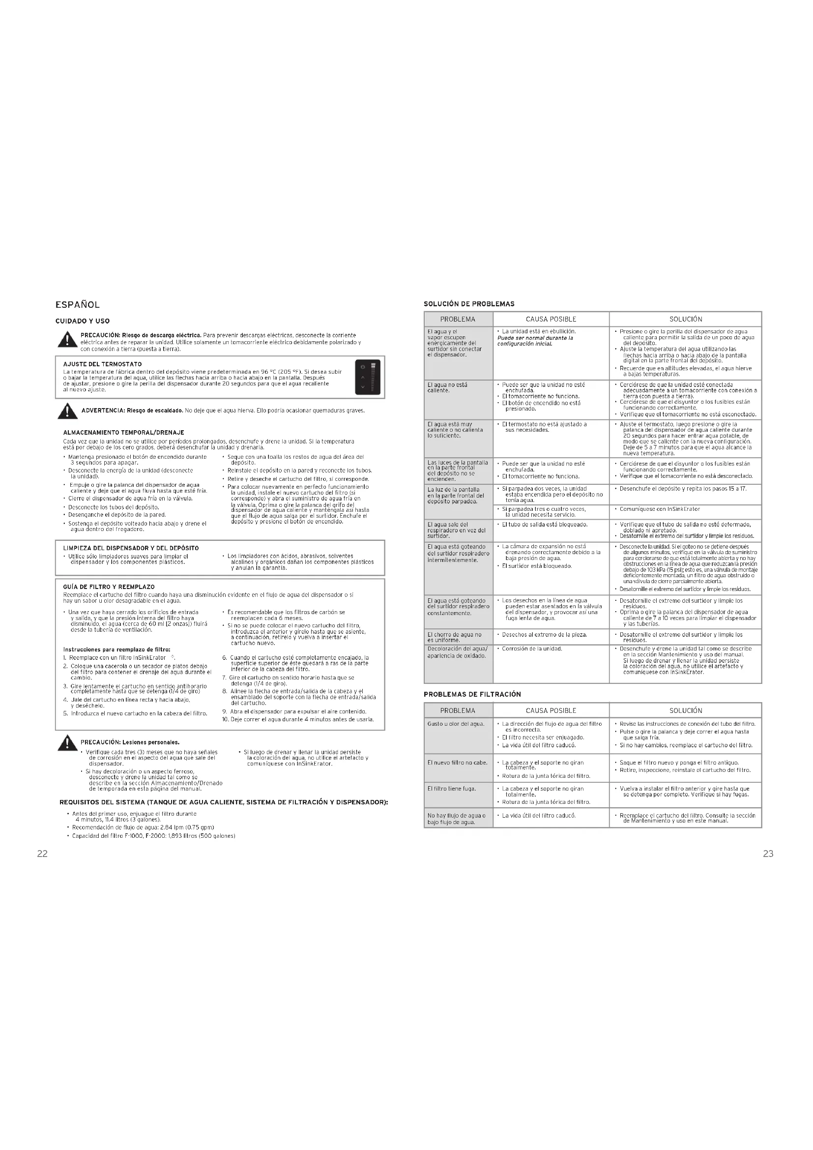 El agua y el vapor escupen enérgicamente del surtidor sin conectar el dispensador. Gusto u olor del agua. El agua no está caliente. El nuevo ltro no cabe. El agua está muy caliente o no calienta lo suciente. Las luces de la pantalla en la parte frontal del depósito no se encienden. La luz de la pantalla en la parte frontal del depósito parpadea. El ltro tiene fuga. El agua sale del respiradero en vez del surtidor. No hay ujo de agua o bajo ujo de agua. El agua está goteando del surtidor respiradero intermitentemente. El agua está goteando del surtidor respiradero constantemente. Decoloración del agua/ apariencia de oxidado. El chorro de agua no es uniforme.