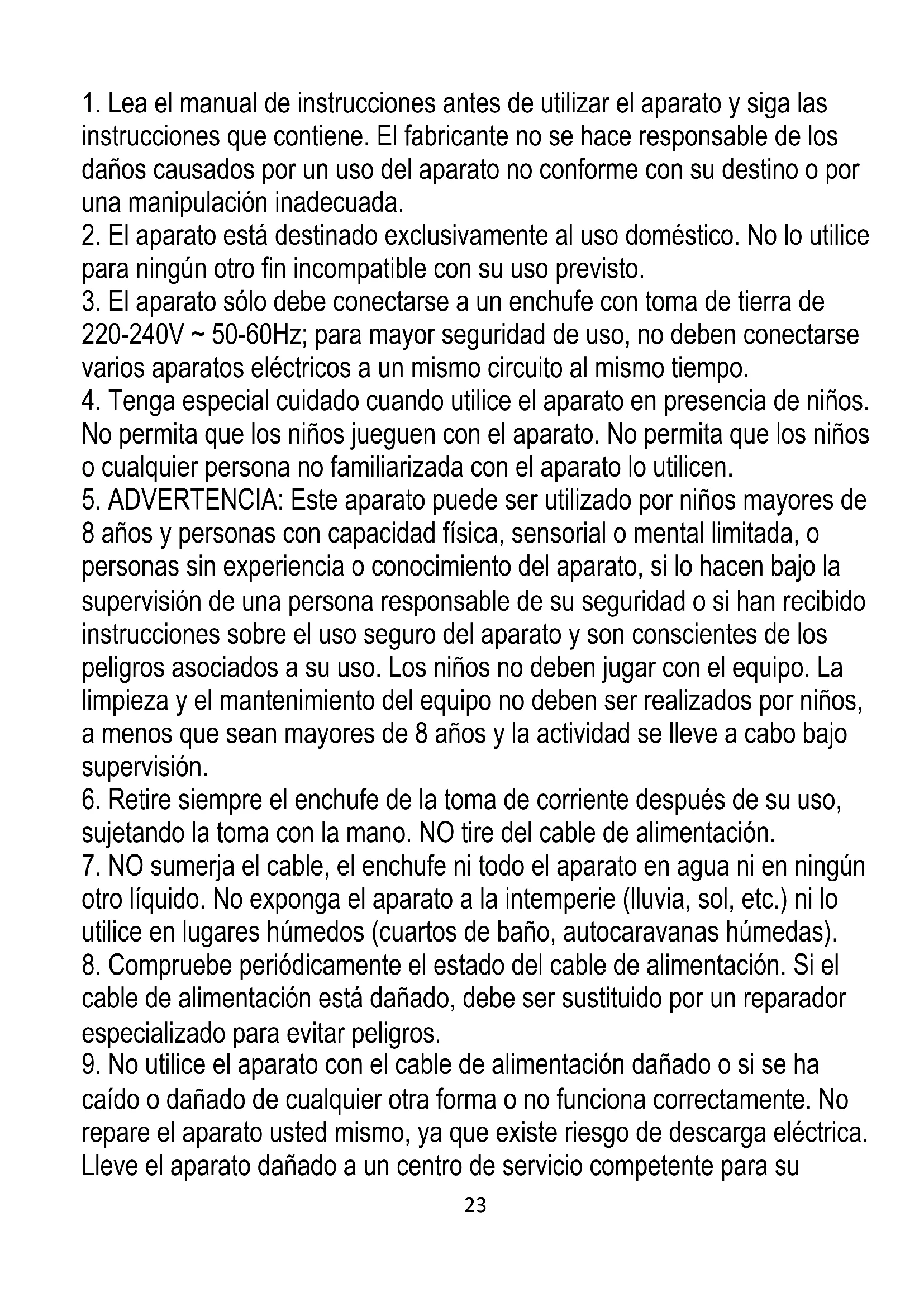 220-240V ~ 50-60Hz; para mayor seguridad de uso, no deben conectarse varios aparatos eléctricos a un mismo circuito al mismo tiempo.