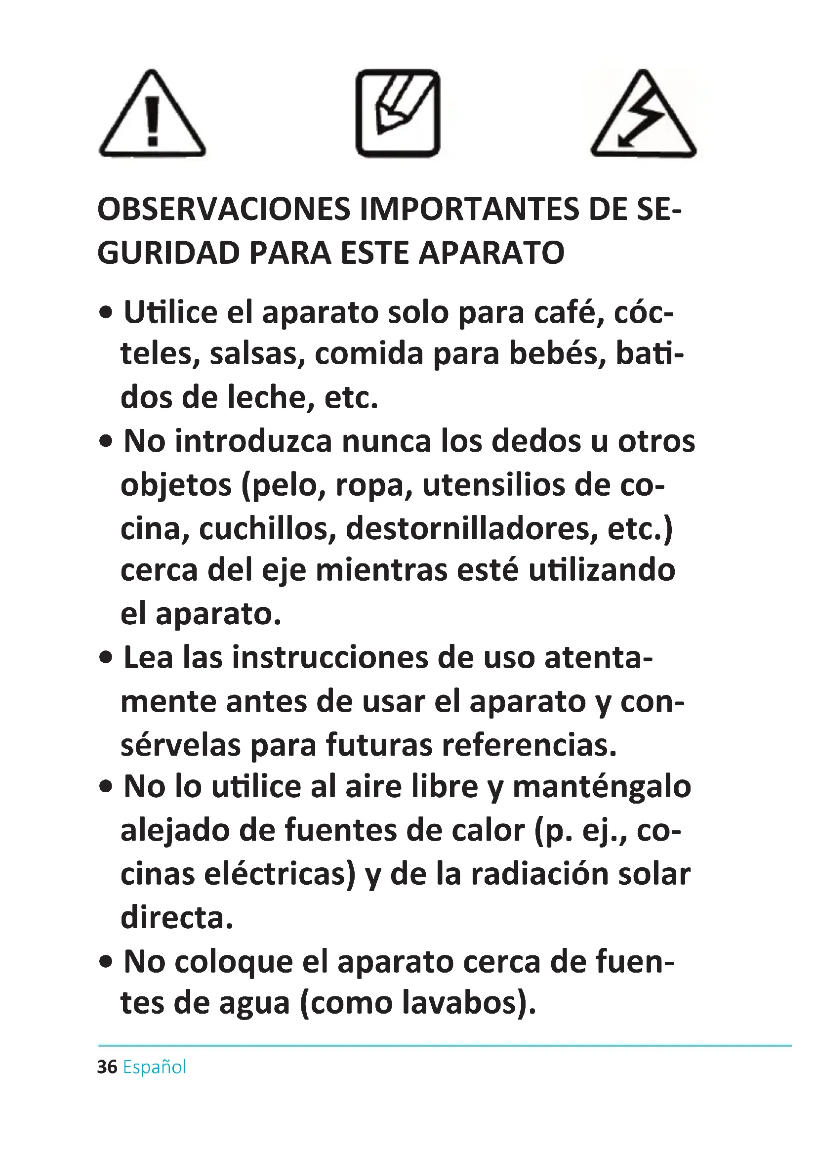 - No introduzca nunca los dedos u otros objetos (pelo, ropa, utensilios de co- cina, cuchillos, destornilladores, etc.) cerca del eje mientras esté ulizando el aparato.
