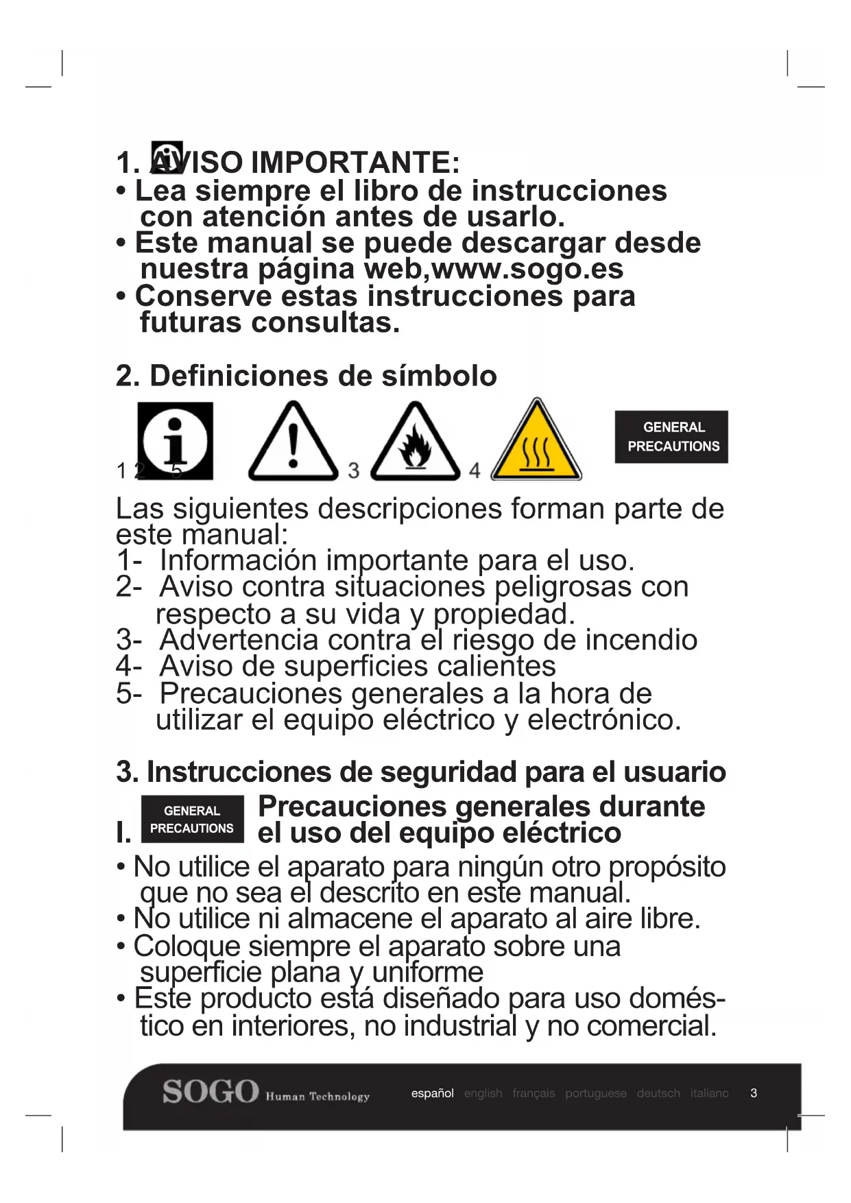LUFTFRITTEUSE 2015 / 863 / EU Precaución: lea y conserve estas importantes instrucciones Este manual se puede descargar desde nuestra página web, www.sogo.es en las siguiente idiomas. ESPAÑOL, CATALAN, INGLES, FRANCES, PORTUGUES, ALEMAN, ITALIANO Caution: please read and preserve these important instructions This manual can be downloaded from our website, www.sogo.es in the following languages. SPANISH, CATALAN, ENGLISH, FRENCH, PORTUGUESE, GERMAN, ITALIAN FRIGGITRICE AD ARIAAviso importante Definiciones de símbolo Instrucciones de seguridad para el usuario