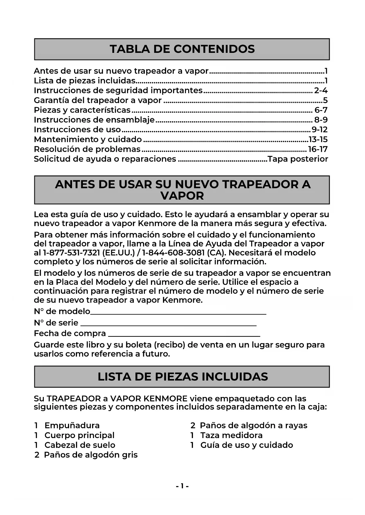 Su TRAPEADOR a VAPOR KENMORE viene empaquetado con las siguientes piezas y componentes incluidos separadamente en la caja: 1 Empuñadura 1 Cuerpo principal 1 Cabezal de suelo 2 Paños de algodón gris Lea esta guía de uso y cuidado. Esto le ayudará a ensamblar y operar su nuevo trapeador a vapor Kenmore de la manera más segura y efectiva. Para obtener más información sobre el cuidado y el funcionamiento del trapeador a vapor, llame a la Línea de Ayuda del Trapeador a vapor al 1-877-531-7321 (EE.UU.) / 1-844-608-3081 (CA). Necesitará el modelo completo y los números de serie al solicitar información. El modelo y los números de serie de su trapeador a vapor se encuentran en la Placa del Modelo y del número de serie. Utilice el espacio a continuación para registrar el número de modelo y el número de serie de su nuevo trapeador a vapor Kenmore. N° de modelo____________________________________________ N° de serie ____________________________________________ Fecha de compra ______________________________________ Guarde este libro y su boleta (recibo) de venta en un lugar seguro para usarlos como referencia a futuro. ANTES DE USAR SU NUEVO TRAPEADOR A VAPOR 2 Paños de algodón a rayas 1 Taza medidora 1 Guía de uso y cuidado- 2 - ¡ADVERTENCIA! Su seguridad es importante para nosotros. Para reducir el riesgo de incendio, descarga eléctrica, lesiones a personas o daños al usar su trapeador a vapor, siga las precauciones básicas de seguridad, incluidas las siguientes: