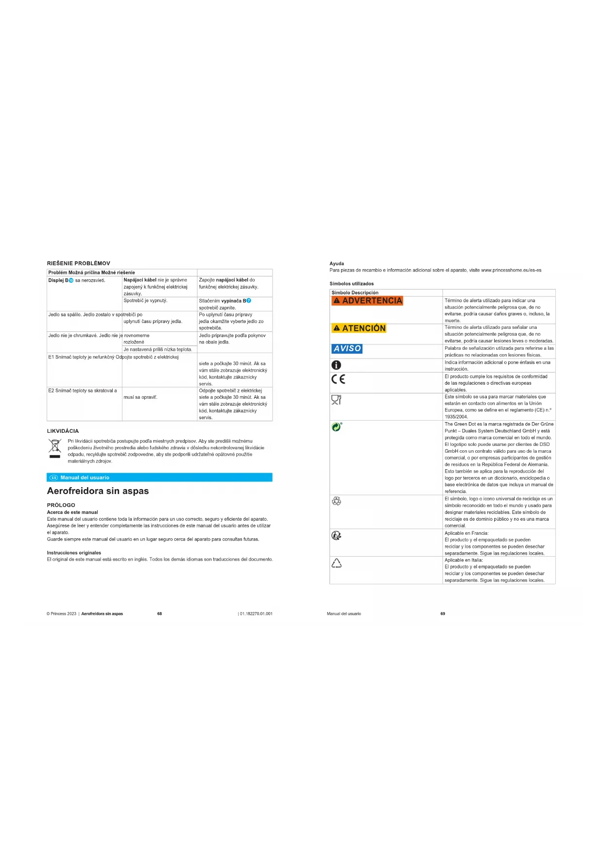 ATENCIÓN Término de alerta utilizado para señalar una situación potencialmente peligrosa que, de no evitarse, podría causar lesiones leves o moderadas. AVISO Palabra de señalización utilizada para referirse a las prácticas no relacionadas con lesiones físicas. Indica información adicional o pone énfasis en una instrucción. El producto cumple los requisitos de conformidad de las regulaciones o directivas europeas aplicables. Este símbolo se usa para marcar materiales que estarán en contacto con alimentos en la Unión Europea, como se dene en el reglamento (CE) n.º 1935/2004. The Green Dot es la marca registrada de Der Grüne Punkt – Duales System Deutschland GmbH y está protegida como marca comercial en todo el mundo. El logotipo solo puede usarse por clientes de DSD GmbH con un contrato válido para uso de la marca comercial, o por empresas participantes de gestión de residuos en la República Federal de Alemania. Esto también se aplica para la reproducción del logo por terceros en un diccionario, enciclopedia o base electrónica de datos que incluya un manual de referencia. El símbolo, logo o icono universal de reciclaje es un símbolo reconocido en todo el mundo y usado para designar materiales reciclables. Este símbolo de reciclaje es de dominio público y no es una marca comercial. Aplicable en Francia: El producto y el empaquetado se pueden reciclar y los componentes se pueden desechar separadamente. Sigue las regulaciones locales. Aplicable en Italia: El producto y el empaquetado se pueden reciclar y los componentes se pueden desechar separadamente. Sigue las regulaciones locales.70 71© Princess 2023 | Aerofreidora sin aspas | 01.182270.01.001 Manual del usuario Los productos eléctricos viejos no deben eliminarse conla basura doméstica. Recíclelos en instalaciones al efecto. Sinecesita ayuda en temas de reciclaje, consulte a las autoridades ocomercios locales.