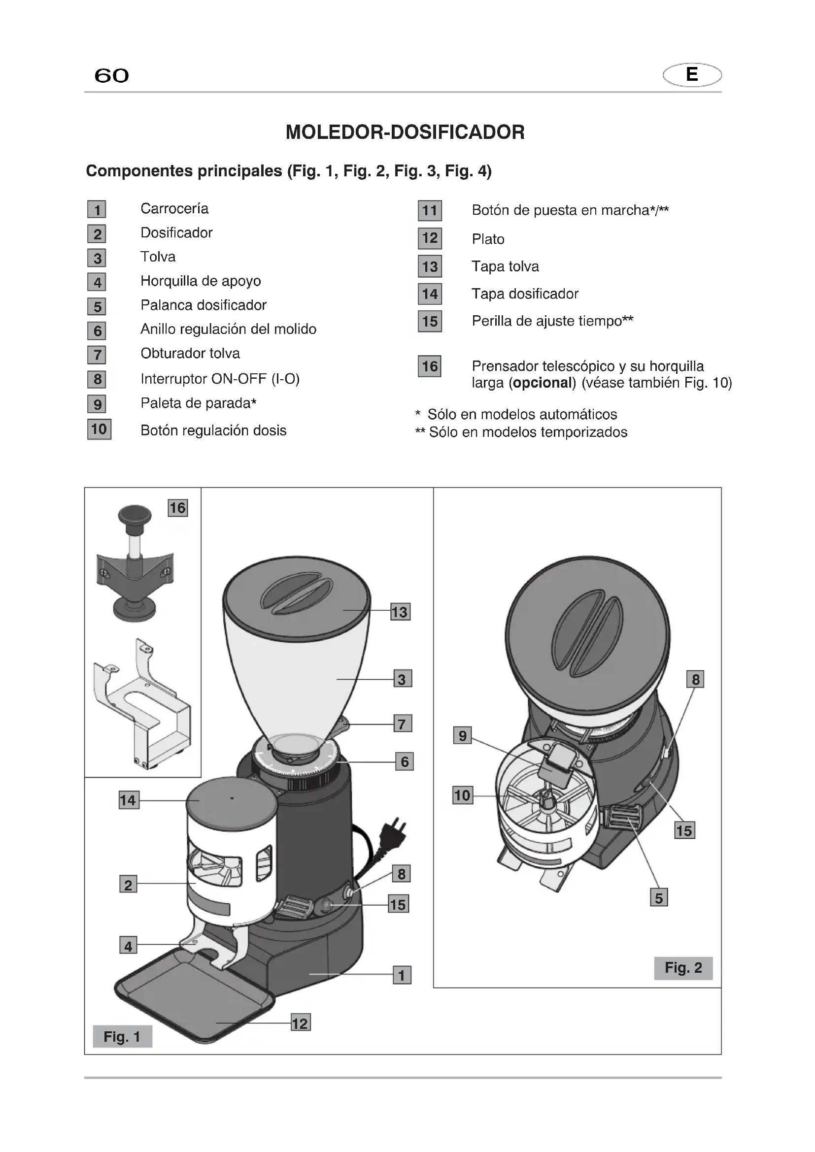 MOLEDOR-DOSIFICADOR Componentes principales (Fig. 1, Fig. 2, Fig. 3, Fig. 4) Carrocería Dosificador Tolva Horquilla de apoyo Palanca dosificador Anillo regulación del molido Obturador tolva Interruptor ON-OFF (I-O) Paleta de parada