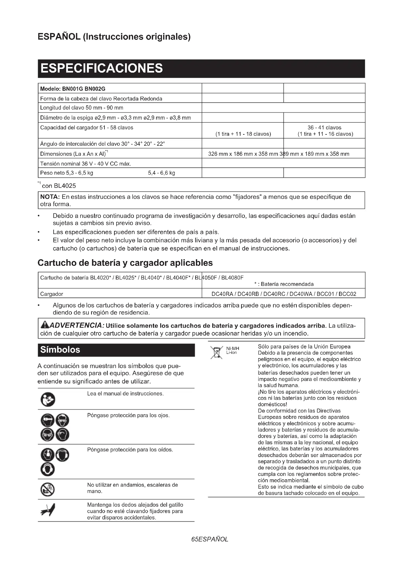 - Algunos de los cartuchos de batería y cargadores indicados arriba puede que no estén disponibles depen- diendo de su región de residencia. ADVERTENCIA: Utilice solamente los cartuchos de batería y cargadores indicados arriba. La utiliza- ción de cualquier otro cartucho de batería y cargador puede ocasionar heridas y/o un incendio. Símbolos A continuación se muestran los símbolos que pue- den ser utilizados para el equipo. Asegúrese de que entiende su signicado antes de utilizar. Lea el manual de instrucciones. Póngase protección para los ojos. Póngase protección para los oídos. No utilizar en andamios, escaleras de mano. Mantenga los dedos alejados del gatillo cuando no esté clavando jadores para evitar disparos accidentales. Ni-MH Li-ion Sólo para países de la Unión Europea Debido a la presencia de componentes peligrosos en el equipo, el equipo eléctrico y electrónico, los acumuladores y las baterías desechados pueden tener un impacto negativo para el medioambiente y la salud humana. ¡No tire los aparatos eléctricos y electróni- cos ni las baterías junto con los residuos domésticos! De conformidad con las Directivas Europeas sobre residuos de aparatos eléctricos y electrónicos y sobre acumu- ladores y baterías y residuos de acumula- dores y baterías, así como la adaptación de las mismas a la ley nacional, el equipo eléctrico, las baterías y los acumuladores desechados deberán ser almacenados por separado y trasladados a un punto distinto de recogida de desechos municipales, que cumpla con los reglamentos sobre protec- ción medioambiental. Esto se indica mediante el símbolo de cubo de basura tachado colocado en el equipo.66 ESPAÑOL Uso previsto Esta herramienta ha sido prevista para el trabajo interior preliminar, como jación de viguetas de piso o cabrios comunes y trabajo de estructuración en vivien- das de 2″ x 4″. Ruido El nivel de ruido A-ponderado típico determinado de acuerdo con la norma EN60745-2-16: Modelo BN001G Nivel de presión sonora (L