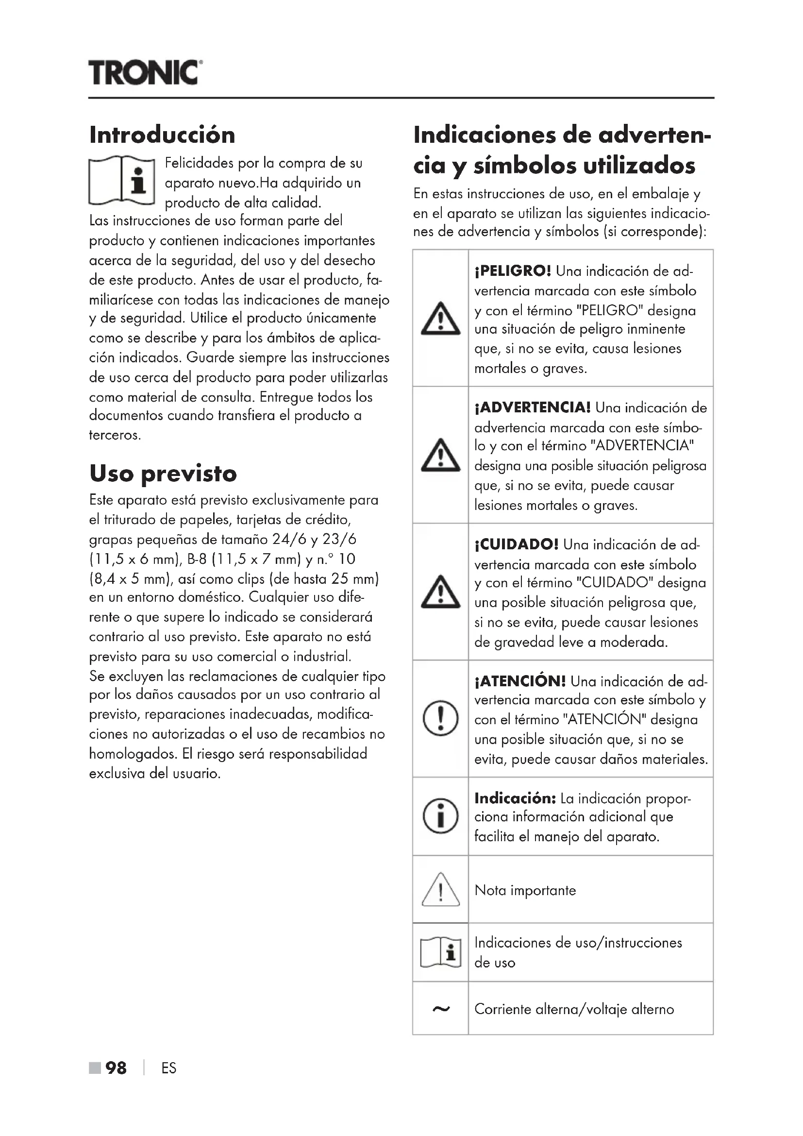 ES Introducción Felicidades por la compra de su aparato nuevo.Ha adquirido un producto de alta calidad. Las instrucciones de uso forman parte del producto y contienen indicaciones importantes acerca de la seguridad, del uso y del desecho de este producto. Antes de usar el producto, fa- miliarícese con todas las indicaciones de manejo y de seguridad. Utilice el producto únicamente como se describe y para los ámbitos de aplica- ción indicados. Guarde siempre las instrucciones de uso cerca del producto para poder utilizarlas como material de consulta. Entregue todos los documentos cuando transfiera el producto a terceros. Uso previsto Este aparato está previsto exclusivamente para el triturado de papeles, tarjetas de crédito, grapas pequeñas de tamaño 24/6 y 23/6 (11,5x6mm), B-8 (11,5x7mm) y n.º 10 (8,4x5mm), así como clips (de hasta 25mm) en un entorno doméstico. Cualquier uso dife- rente o que supere lo indicado se considerará contrario al uso previsto. Este aparato no está previsto para su uso comercial o industrial. Se excluyen las reclamaciones de cualquier tipo por los daños causados por un uso contrario al previsto, reparaciones inadecuadas, modifica- ciones no autorizadas o el uso de recambios no homologados. El riesgo será responsabilidad exclusiva del usuario. Indicaciones de adverten- cia y símbolos utilizados En estas instrucciones de uso, en el embalaje y en el aparato se utilizan las siguientes indicacio- nes de advertencia y símbolos (si corresponde): ¡PELIGRO! Una indicación de ad- vertencia marcada con este símbolo y con el término "PELIGRO" designa una situación de peligro inminente que, si no se evita, causa lesiones mortales o graves. ¡ADVERTENCIA! Una indicación de advertencia marcada con este símbo- lo y con el término "ADVERTENCIA" designa una posible situación peligrosa que, si no se evita, puede causar lesiones mortales o graves. ¡CUIDADO! Una indicación de ad- vertencia marcada con este símbolo y con el término "CUIDADO" designa una posible situación peligrosa que, si no se evita, puede causar lesiones de gravedad leve a moderada. ¡ATENCIÓN! Una indicación de ad- vertencia marcada con este símbolo y con el término "ATENCIÓN" designa una posible situación que, si no se evita, puede causar daños materiales. Indicación: La indicación propor- ciona información adicional que facilita el manejo del aparato. Nota importante Indicaciones de uso/instrucciones de uso