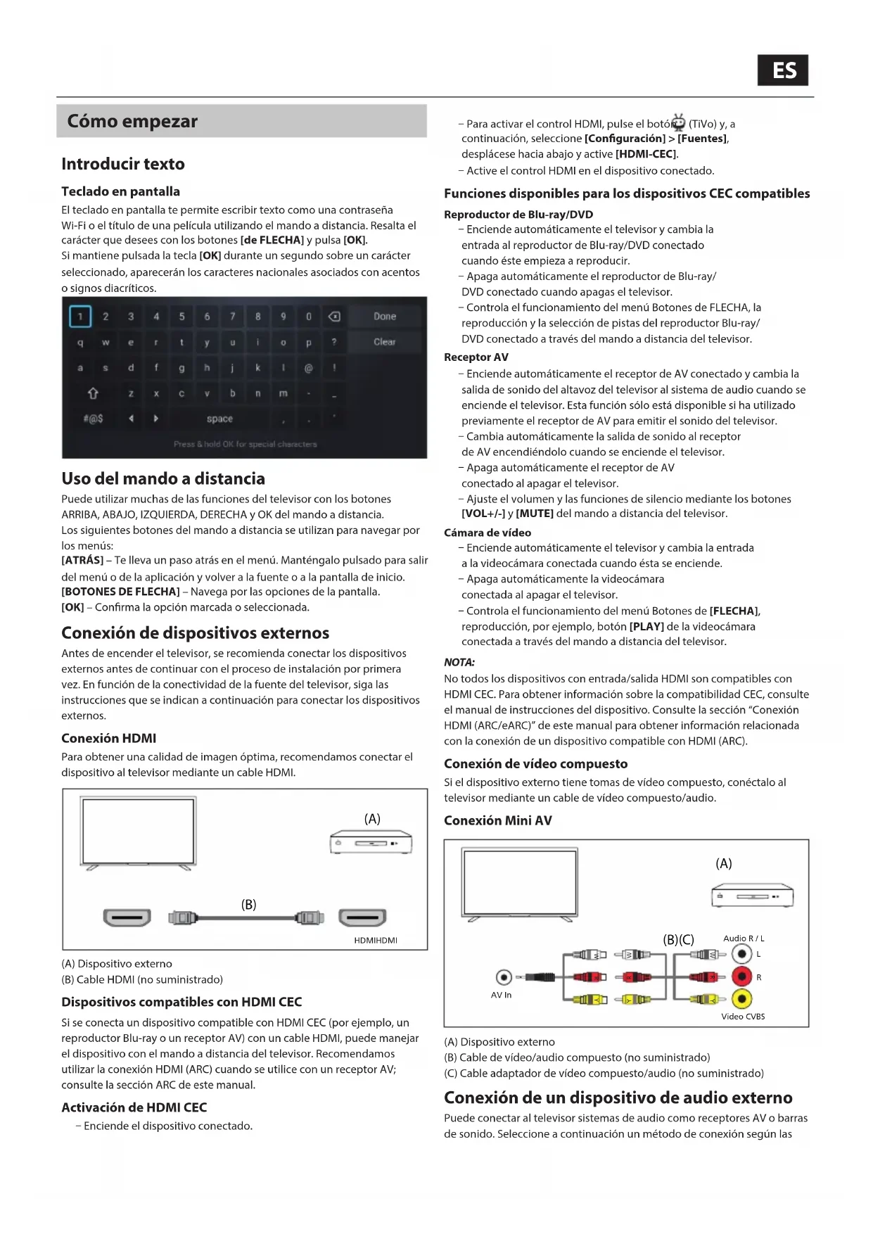 Dopo l’ultimo passaggio, viene eseguito il ripristino dei dati di fabbrica e al riavvio del televisore viene visualizzata la prima schermata di installazione.ES Cómo empezar Introducir texto Teclado en pantalla El teclado en pantalla te permite escribir texto como una contraseña Wi-Fi o el título de una película utilizando el mando a distancia. Resalta el carácter que desees con los botones [de FLECHA] y pulsa [OK].Si mantiene pulsada la tecla [OK] durante un segundo sobre un carácter seleccionado, aparecerán los caracteres nacionales asociados con acentos o signos diacríticos. Uso del mando a distancia Puede utilizar muchas de las funciones del televisor con los botones ARRIBA, ABAJO, IZQUIERDA, DERECHA y OK del mando a distancia.Los siguientes botones del mando a distancia se utilizan para navegar por los menús:[ATRÁS] – Te lleva un paso atrás en el menú. Manténgalo pulsado para salir del menú o de la aplicación y volver a la fuente o a la pantalla de inicio.[BOTONES DE FLECHA] – Navega por las opciones de la pantalla.[OK] – Conrma la opción marcada o seleccionada. Conexión de dispositivos externos Antes de encender el televisor, se recomienda conectar los dispositivos externos antes de continuar con el proceso de instalación por primera vez. En función de la conectividad de la fuente del televisor, siga las instrucciones que se indican a continuación para conectar los dispositivos externos. Conexión HDMI Para obtener una calidad de imagen óptima, recomendamos conectar el dispositivo al televisor mediante un cable HDMI. (B) (A) HDMIHDMI(A) Dispositivo externo(B) Cable HDMI (no suministrado) Dispositivos compatibles con HDMI CEC Si se conecta un dispositivo compatible con HDMI CEC (por ejemplo, un reproductor Blu-ray o un receptor AV) con un cable HDMI, puede manejar el dispositivo con el mando a distancia del televisor. Recomendamos utilizar la conexión HDMI (ARC) cuando se utilice con un receptor AV; consulte la sección ARC de este manual. Activación de HDMI CEC ū Enciende el dispositivo conectado. ū Para activar el control HDMI, pulse el botón (TiVo) y, a continuación, seleccione [Conguración] > [Fuentes], desplácese hacia abajo y active [HDMI-CEC]. ū Active el control HDMI en el dispositivo conectado. Funciones disponibles para los dispositivos CEC compatibles Reproductor de Blu-ray/DVD ū Enciende automáticamente el televisor y cambia la entrada al reproductor de Blu-ray/DVD conectado cuando éste empieza a reproducir. ū Apaga automáticamente el reproductor de Blu-ray/DVD conectado cuando apagas el televisor. ū Controla el funcionamiento del menú Botones de FLECHA, la reproducción y la selección de pistas del reproductor Blu-ray/DVD conectado a través del mando a distancia del televisor.Receptor AV ū Enciende automáticamente el receptor de AV conectado y cambia la salida de sonido del altavoz del televisor al sistema de audio cuando se enciende el televisor. Esta función sólo está disponible si ha utilizado previamente el receptor de AV para emitir el sonido del televisor. ū Cambia automáticamente la salida de sonido al receptor de AV encendiéndolo cuando se enciende el televisor. ū Apaga automáticamente el receptor de AV conectado al apagar el televisor. ū Ajuste el volumen y las funciones de silencio mediante los botones [VOL+/-] y [MUTE] del mando a distancia del televisor.Cámara de vídeo ū Enciende automáticamente el televisor y cambia la entrada a la videocámara conectada cuando ésta se enciende. ū Apaga automáticamente la videocámara conectada al apagar el televisor. ū Controla el funcionamiento del menú Botones de [FLECHA], reproducción, por ejemplo, botón [PLAY] de la videocámara conectada a través del mando a distancia del televisor.NOTA:No todos los dispositivos con entrada/salida HDMI son compatibles con HDMI CEC. Para obtener información sobre la compatibilidad CEC, consulte el manual de instrucciones del dispositivo. Consulte la sección “Conexión HDMI (ARC/eARC)” de este manual para obtener información relacionada con la conexión de un dispositivo compatible con HDMI (ARC). Conexión de vídeo compuesto Si el dispositivo externo tiene tomas de vídeo compuesto, conéctalo al televisor mediante un cable de vídeo compuesto/audio. Conexión Mini AV
