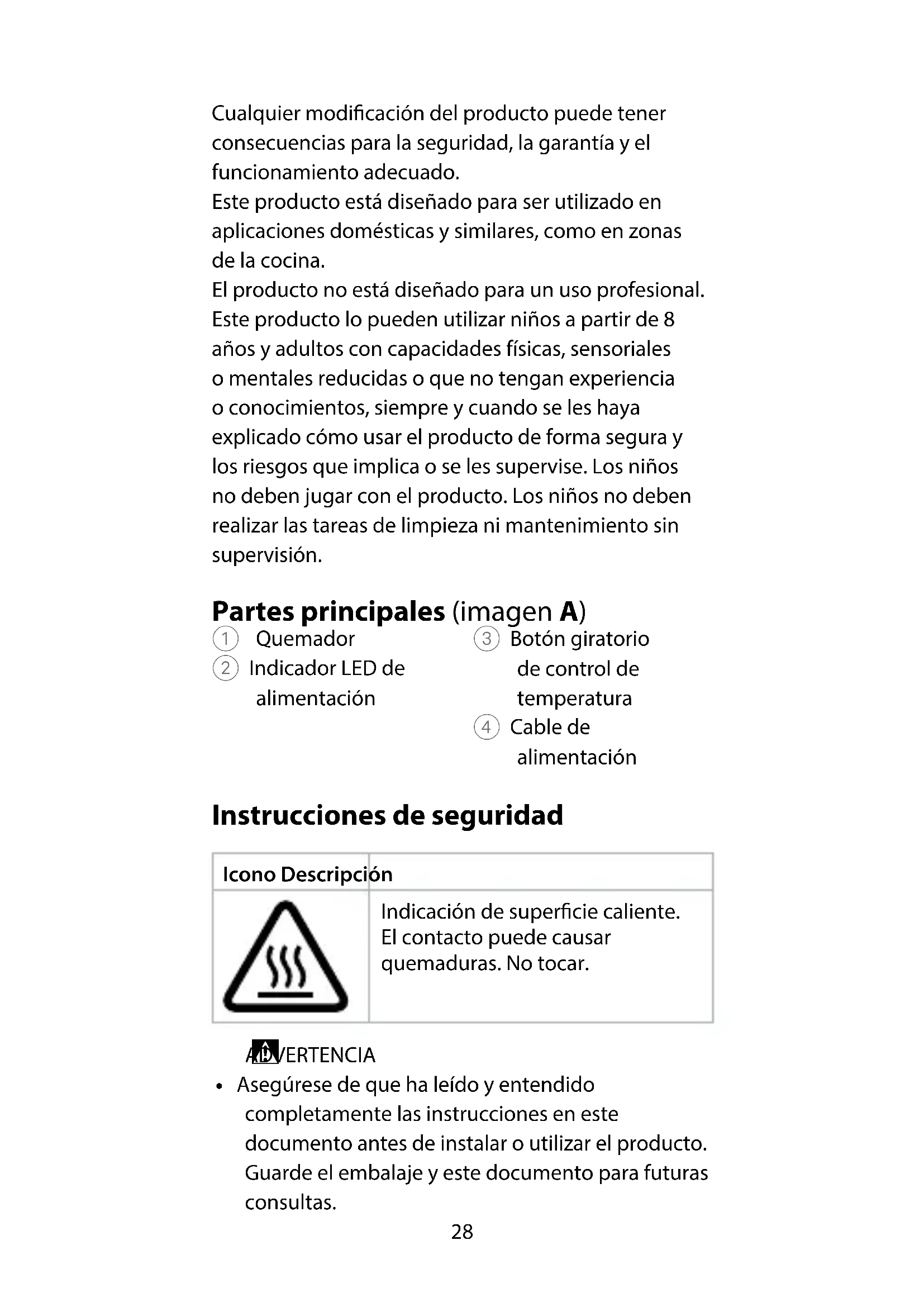 - Tenga cuidado al manipular el producto. El producto guarda calor residual después de su uso.