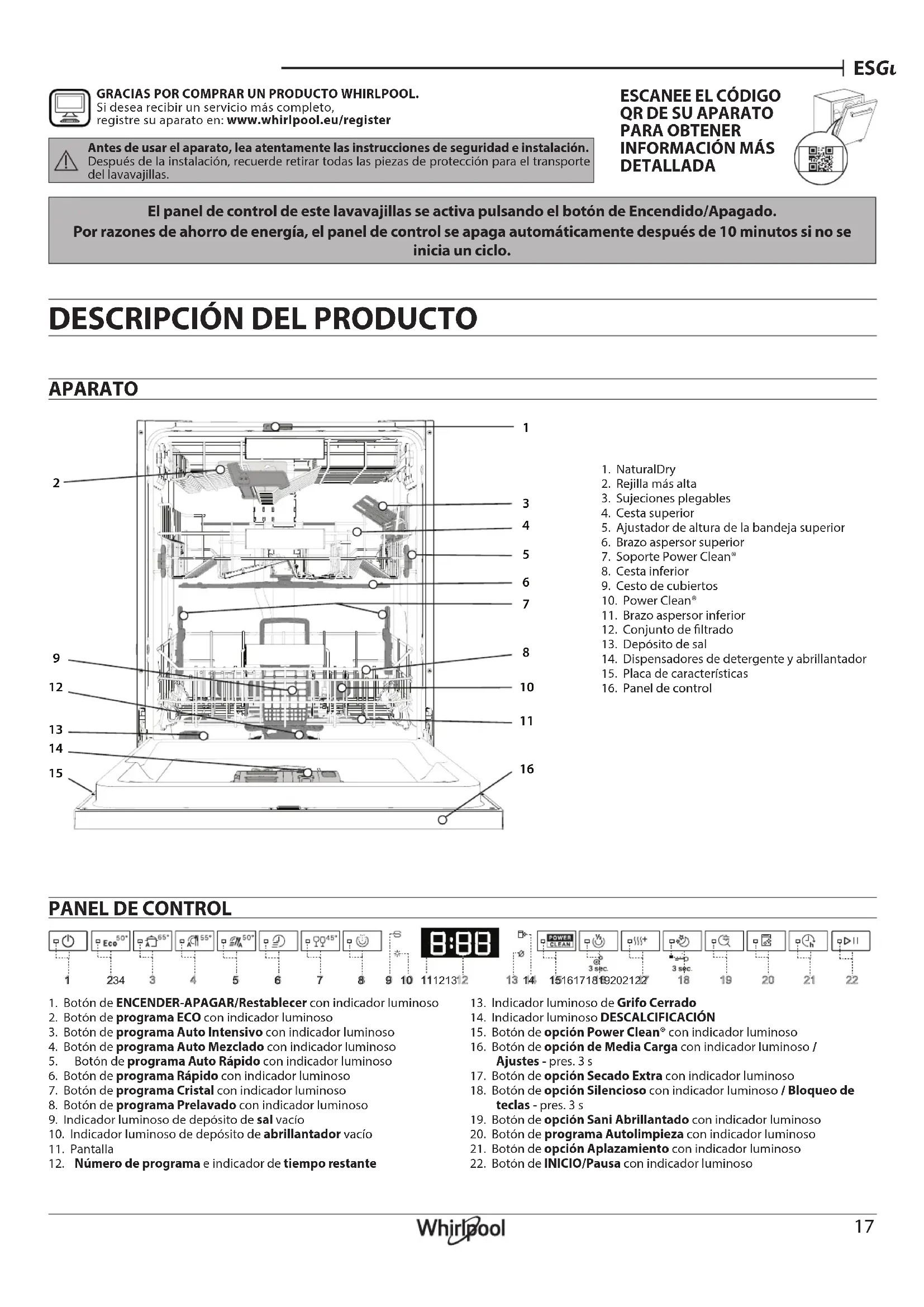 13. Indicador luminoso de Grifo Cerrado14. Indicador luminoso DESCALCIFICACIÓN15. Botón de opción Power Clean® con indicador luminoso16. Botón de opción de Media Carga con indicador luminoso / Ajustes - pres. 3 s 17. Botón de opción Secado Extra con indicador luminoso18. Botón de opción Silencioso con indicador luminoso / Bloqueo de teclas - pres. 3 s 19. Botón de opción Sani Abrillantado con indicador luminoso20. Botón de programa Autolimpieza con indicador luminoso21. Botón de opción Aplazamiento con indicador luminoso22. Botón de INICIO/Pausa con indicador luminosoGRACIAS POR COMPRAR UN PRODUCTO WHIRLPOOL. Si desea recibir un servicio más completo, registre su aparato en: www.whirlpool.eu/registerAntes de usar el aparato, lea atentamente las instrucciones de seguridad e instalación.Después de la instalación, recuerde retirar todas las piezas de protección para el transporte del lavavajillas.