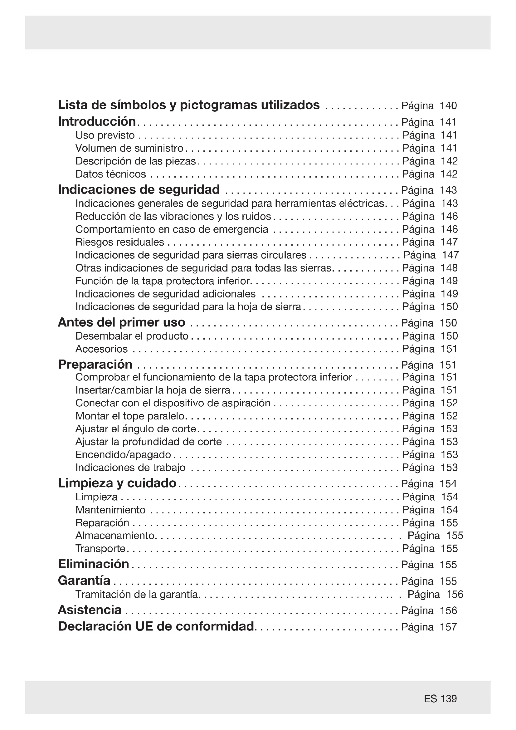 Lista de símbolos y pictogramas utilizados ............ . Página 140 Introducción............................................ . Página 141 Uso previsto ............................................ . Página 141 Volumen de suministro .................................... . Página 141 Descripción de las piezas.................................. . Página 142 Datos técnicos .......................................... . Página 142 Indicaciones de seguridad ............................. . Página 143 Indicaciones generales de seguridad para herramientas eléctricas. . . Página 143 Reducción de las vibraciones y los ruidos ..................... . Página 146 Comportamiento en caso de emergencia ..................... . Página 146 Riesgos residuales ....................................... . Página 147 Indicaciones de seguridad para sierras circulares . . . . . . . . . . . . . . . . Página 147 Otras indicaciones de seguridad para todas las sierras........... . Página 148 Función de la tapa protectora inferior......................... . Página 149 Indicaciones de seguridad adicionales ....................... . Página 149 Indicaciones de seguridad para la hoja de sierra................ . Página 150 Antes del primer uso ................................... . Página 150 Desembalar el producto ................................... . Página 150 Accesorios ............................................. . Página 151 Preparación ............................................ . Página 151 Comprobar el funcionamiento de la tapa protectora inferior ....... . Página 151 Insertar/cambiar la hoja de sierra ............................ . Página 151 Conectar con el dispositivo de aspiración ..................... . Página 152 Montar el tope paralelo.................................... . Página 152 Ajustar el ángulo de corte.................................. . Página 153 Ajustar la profundidad de corte ............................. . Página 153 Encendido/apagado ...................................... . Página 153 Indicaciones de trabajo ................................... . Página 153 Limpieza y cuidado..................................... . Página 154 Limpieza . . . . . . . . . . . . . . . . . . . . . . . . . . . . . . . . . . . . . . . . . . . . . . . . Página 154 Mantenimiento .......................................... . Página 154 Reparación ............................................. . Página 155 Almacenamiento........................................ . . Página 155 Transporte.............................................. . Página 155 Eliminación ............................................. . Página 155 Garantía ................................................ . Página 155 Tramitación de la garantía................................. . . Página 156 Asistencia .............................................. . Página 156 Declaración UE de conformidad........................ . Página 157140