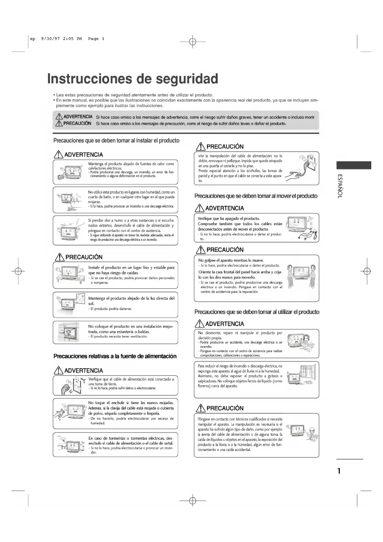 ?Leaestasprecaucionesdeseguridadatentamenteantesdeutilizarelproducto.?Enestemanual,esposiblequelasilustracionesnocoincidanexactamenteconlaaparienciarealdelproducto,yaqueseincluyensim-plementecomoejemploparailustrarlasinstrucciones.Sihacecasoomisoalosmensajesdeadvertencia,correelriesgosufrirdanosgraves,tenerunaccidenteoinclusomorir.Sihacecasoomisoalosmensajesdeprecaucion,correelriesgodesufrirdanoslevesodanarelproducto. Precauciones que