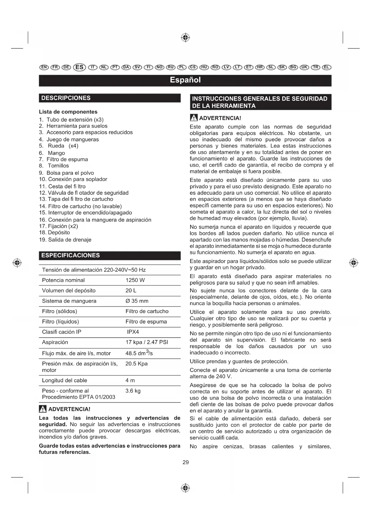 ESPECIFICACIONES Tensión de alimentación 220-240V~50 Hz Potencia nominal 1250 W Volumen del depósito 20 L Sistema de manguera Ø 35 mm Filtro (sólidos) Filtro de cartucho Filtro (líquidos) Filtro de espuma Clasifi cación IP IPX4 Aspiración 17 kpa / 2.47 PSI Flujo máx. de aire l/s, motor 48.5 dm