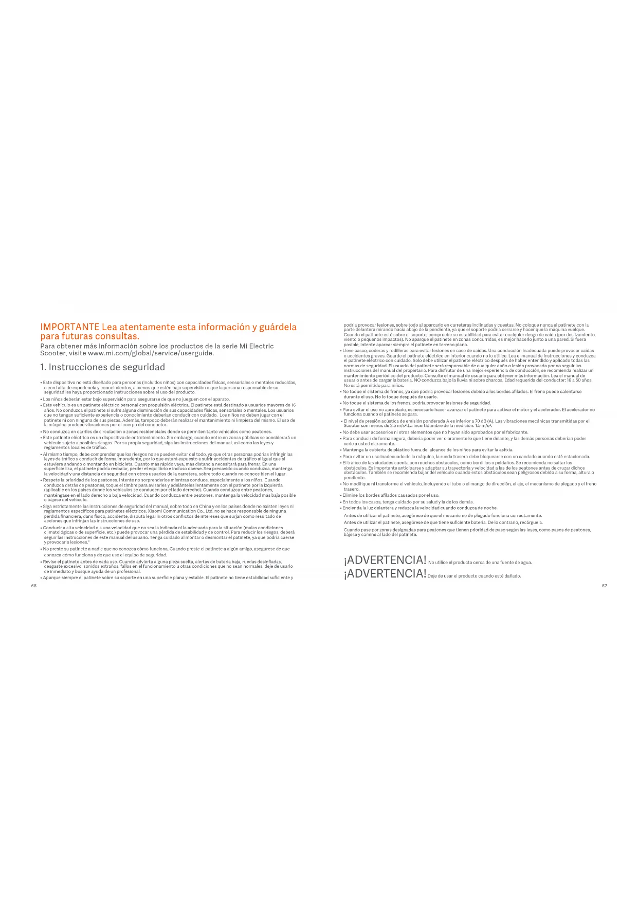 - No modifique ni transforme el vehículo, incluyendo el tubo o el mango de dirección, el eje, el mecanismo de plegado y el freno trasero.• Elimine los bordes afilados causados por el uso.• En todos los casos, tenga cuidado por su salud y la de los demás.• Encienda la luz delantera y reduzca la velocidad cuando conduzca de noche. Antes de utilizar el patinete, asegúrese de que el mecanismo de plegado funciona correctamente. Antes de utilizar el patinete, asegúrese de que tiene suficiente batería. De lo contrario, recárguela. Cuando pase por zonas designadas para peatones que tienen prioridad de paso según las leyes, como pasos de peatones, bájese y camine al lado del patinete. ¡ADVERTENCIA! No utilice el producto cerca de una fuente de agua. ¡ADVERTENCIA! Deje de usar el producto cuando esté dañado. ВАЖНАЯ ИНФОРМАЦИЯ! Внимательно прочтите это руководство и сохраните его. Подробную информацию о серии ЭлектросамокатовMi см. на веб-сайте www.mi.com/global/service/userguide. 1. Инструкции по технике безопасности• Этот прибор не должны использовать лица (взрослые или дети) с ограниченными физическими, сенсорными или умственными возможностями и лица, не обладающие соответствующим опытом и знаниями, если они не находятся под присмотром или руководством человека, ответственного за их безопасность.• Не разрешайте детям играть с прибором. • Это транспортное средство представляет собой индивидуальный электросамокат, работающий только на электротяге. Самокат предназначен для гонщиков старше 16 лет. Не ездите на скутере, если у вас ограниченные физические, сенсорные или умственные способности. Гонщики с недостатком опыта или знаний должны ездить осторожно. Детям не следует играть с Самокатом или его запасными частями, а дети не должны производить чистку или техническое обслуживание Использование машины приводит к передаче вибрации по всему телу водителя.