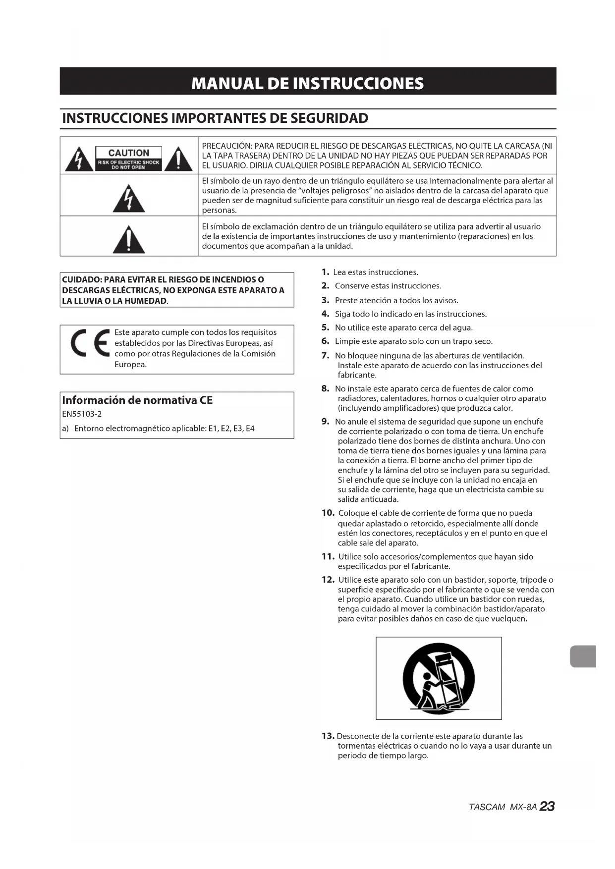 PRECAUCIÓN: PARA REDUCIR EL RIESGO DE DESCARGAS ELÉCTRICAS, NO QUITE LA CARCASA (NI LA TAPA TRASERA) DENTRO DE LA UNIDAD NO HAY PIEZAS QUE PUEDAN SER REPARADAS POR EL USUARIO. DIRIJA CUALQUIER POSIBLE REPARACIÓN AL SERVICIO TÉCNICO.El símbolo de un rayo dentro de un triángulo equilátero se usa internacionalmente para alertar al usuario de la presencia de “voltajes peligrosos” no aislados dentro de la carcasa del aparato que pueden ser de magnitud suficiente para constituir un riesgo real de descarga eléctrica para las personas.El símbolo de exclamación dentro de un triángulo equilátero se utiliza para advertir al usuario de la existencia de importantes instrucciones de uso y mantenimiento (reparaciones) en los documentos que acompañan a la unidad.CUIDADO: PARA EVITAR EL RIESGO DE INCENDIOS O DESCARGAS ELÉCTRICAS, NO EXPONGA ESTE APARATO A LA LLUVIA O LA HUMEDAD.Este aparato cumple con todos los requisitos establecidos por las Directivas Europeas, así como por otras Regulaciones de la Comisión Europea. Información de normativa CE EN55103-2a) Entorno electromagnético aplicable: E1, E2, E3, E4