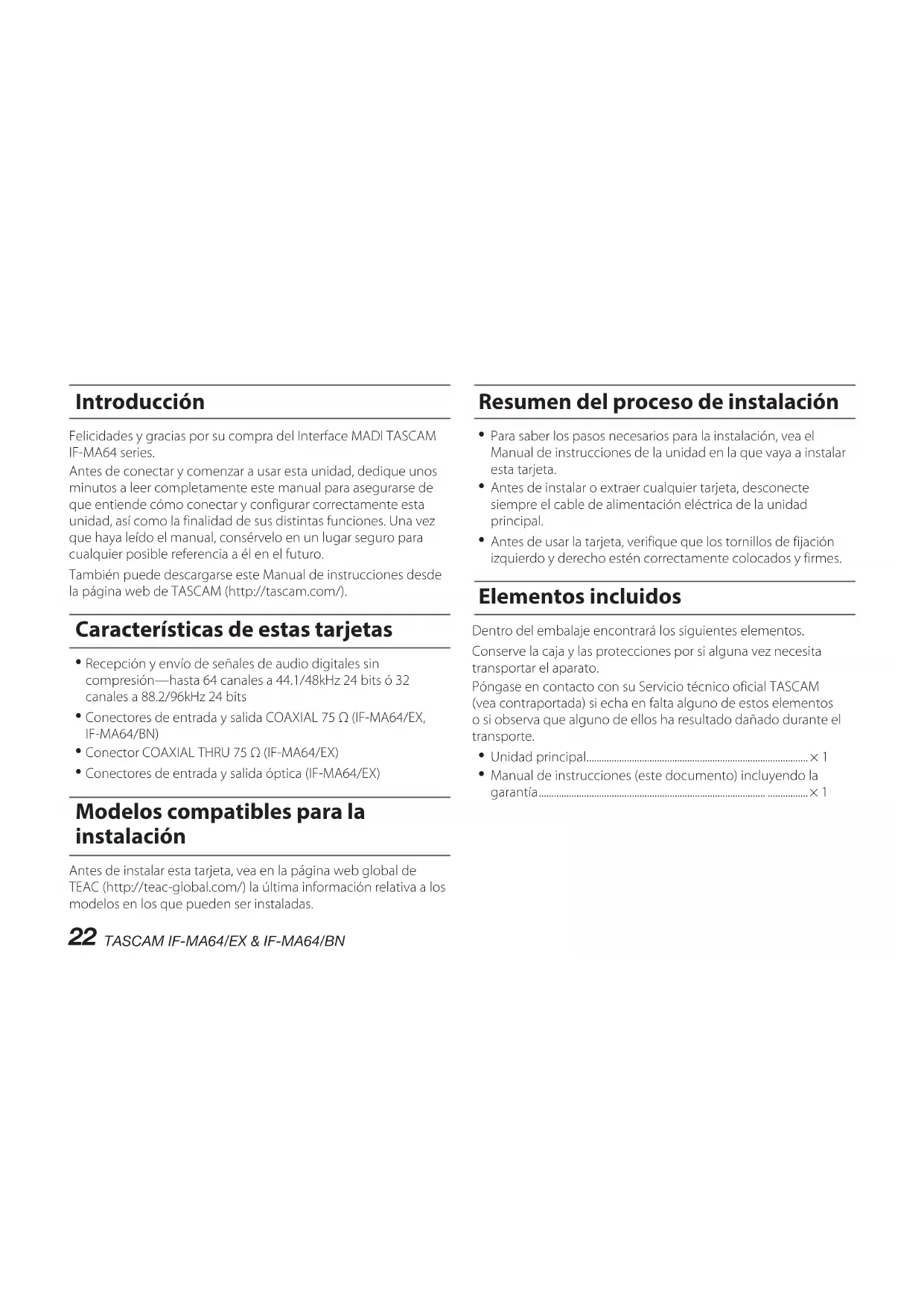De cara a mejoras en el producto, tanto las especificaciones como el aspecto exterior están sujetos a cambios sin previo aviso.TASCAM IF-MA64/EX & IF-MA64/BN – Gebrauchsanleitung