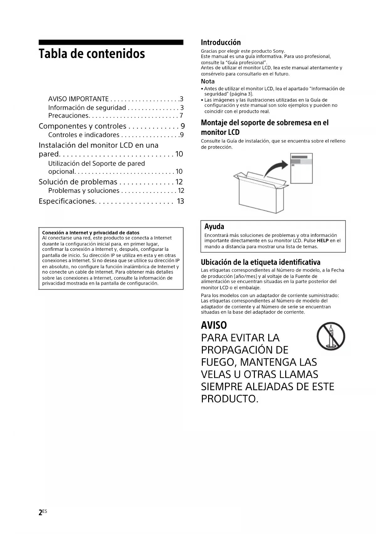 - Especificaciones Introducción Gracias por elegir este producto Sony.Este manual es una guía informativa. Para uso profesional, onsulte la “Guía profesional”.Antes de utilizar el monitor LCD, lea este manual atentamente y onsérvelo para consultarlo en el futuro. Nota p. 13