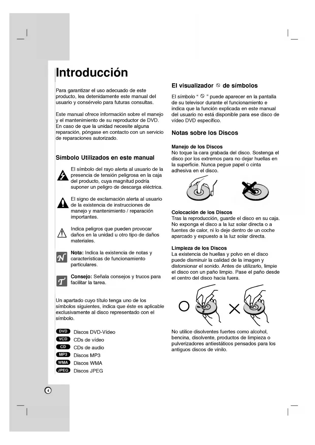 puede aparecerenla pantalla desutelevisorduranteelfuncionamientoeindicaquelafuncion explicada enestemanualdelusuarionoesta disponible paraesediscodevideoDVD especifico. Notas sobre los Discos Manejo delosDiscosNo toque lacara grabada del disco. Sostenga eldiscoporlosextremosparano dejar huellasenla superficie. Nuncapegue papel ocintaadhesivaeneldisco. Colocacion delosDiscosTrasla reproduccion, guarde eldiscoensu caja. Noexpongaeldiscoalaluzsolardirectao afuentesde calor, nilo deje dentrodeuncoche aparcado expuesto alaluzsolardirecta. Limpieza delosDiscosLaexistenciadehuellasy polvo eneldisco puede disminuirlacalidaddela imagen ydistorsionarelsonido.Antesde utilizarlo, limpie eldiscoconun pano limpio. Paseel pano desdeelcentrodeldiscohaciafuera.Noutilicedisolventesfuertescomo alcohol, bencina, disolvente, productos limpieza pulverizadores antiestaticos pensados paralos antiguos discosdevinilo. JPEG WMA MP3